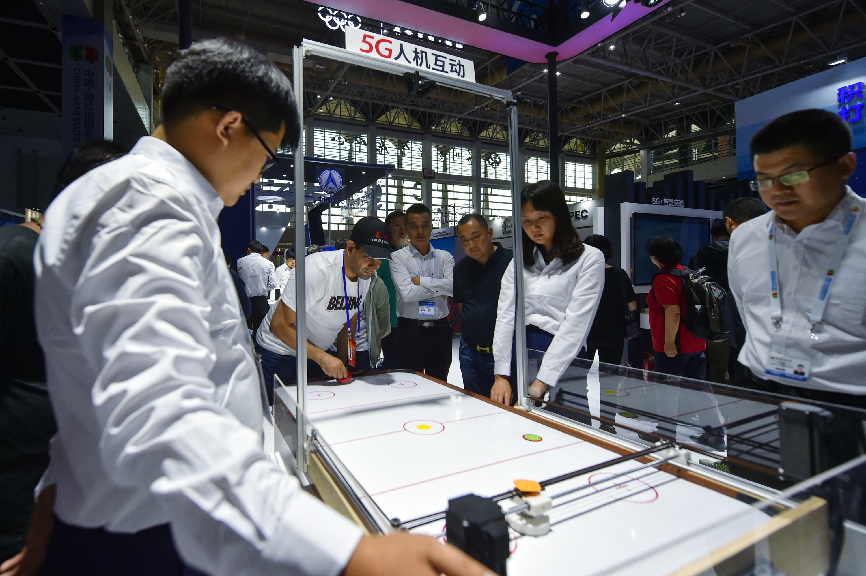 A visitor plays against a computerized opponent powered by 5G technologies in a mini desktop hockey game at the Expo, Sept. 5, 2019. (Xinhua/Li Mangmang)
