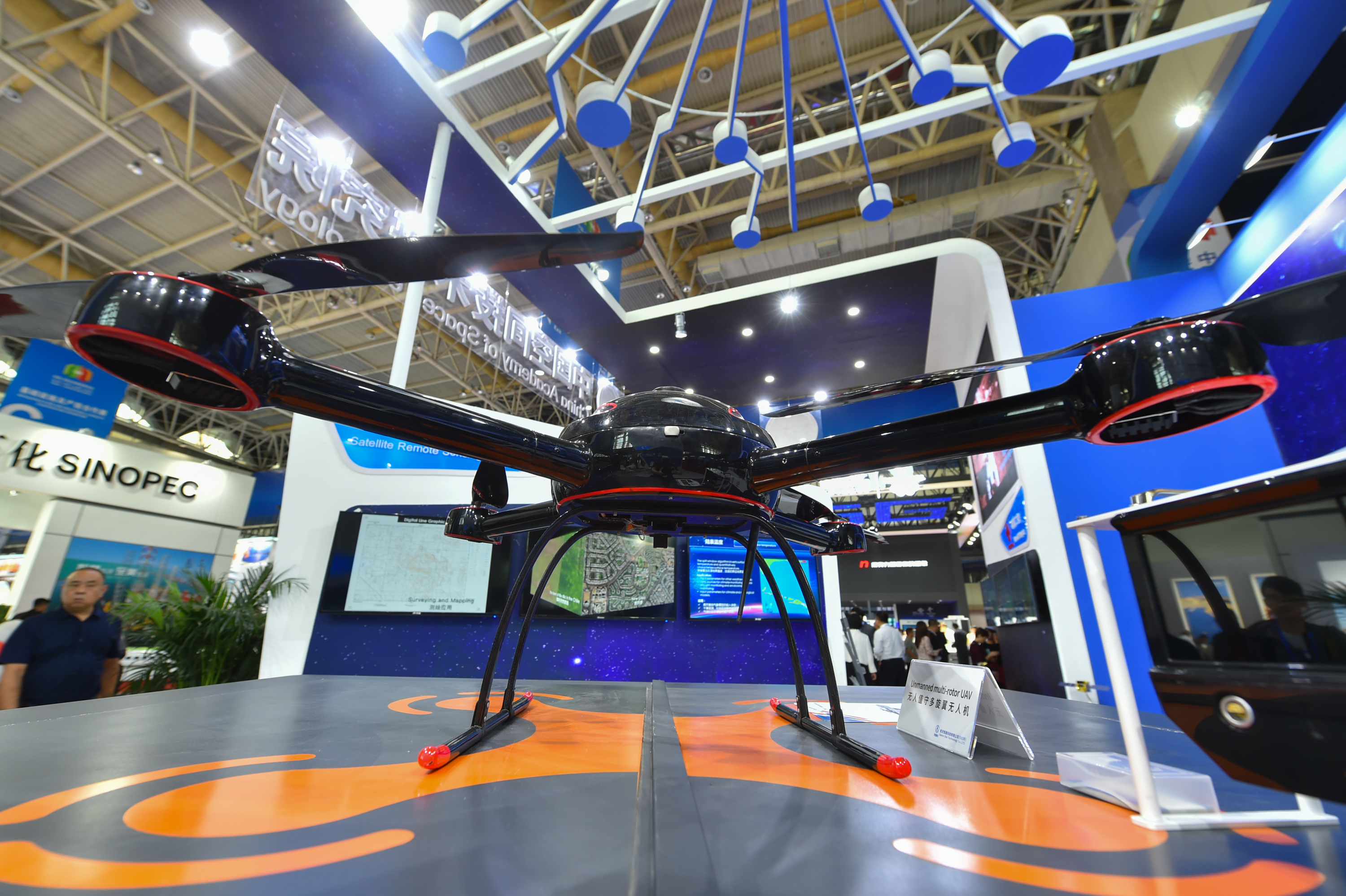 Photo taken on Sept. 6, 2019 shows a multi-rotor UAV (unmanned aerial vehicle) displayed at the Expo. (Xinhua/Li Mangmang)