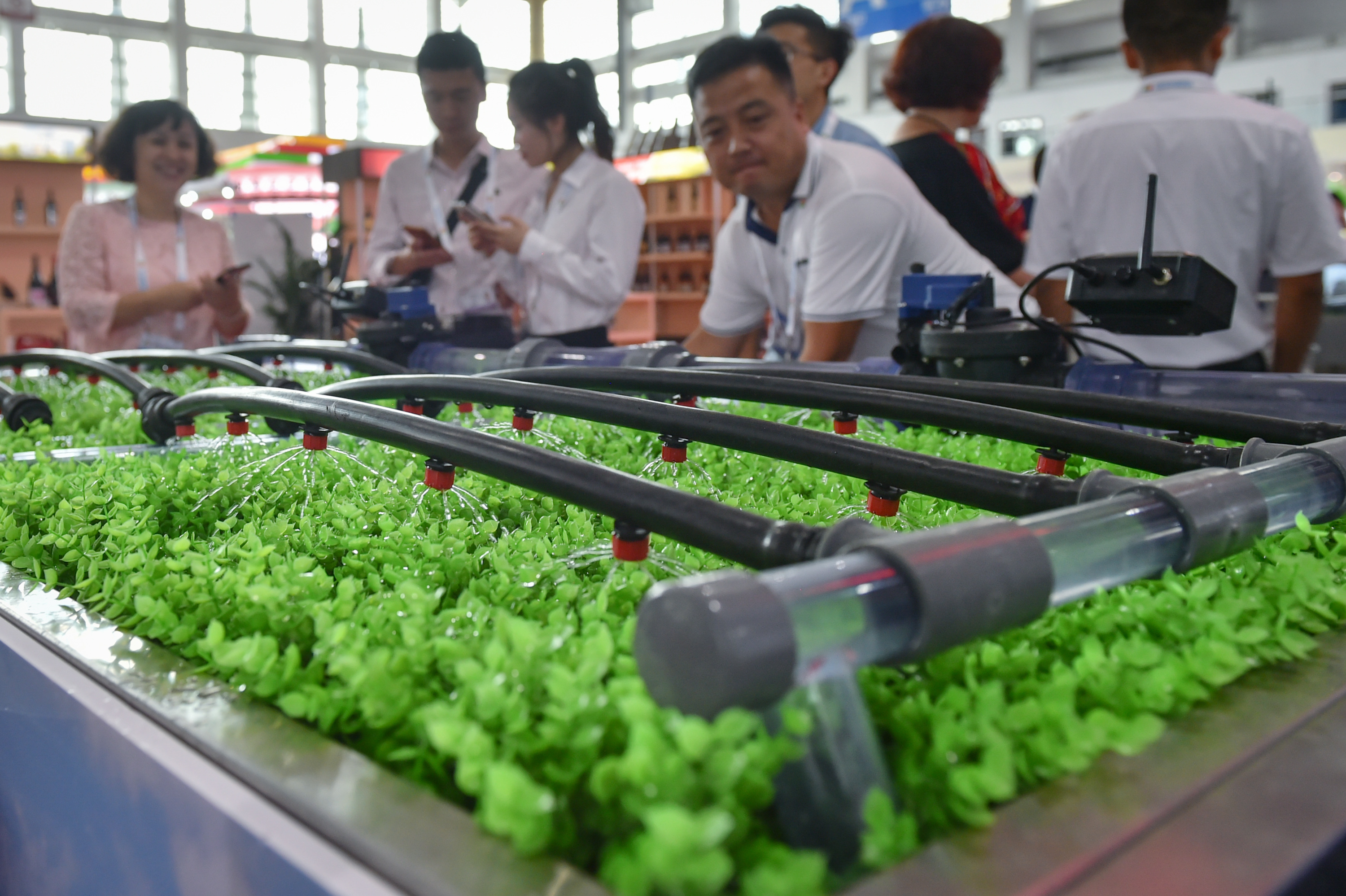 Visitors look at a smart agricultural irrigation system based on the Internet of Things (IoT) technology at the Expo, Sept. 5, 2019. (Xinhua/Li Mangmang)