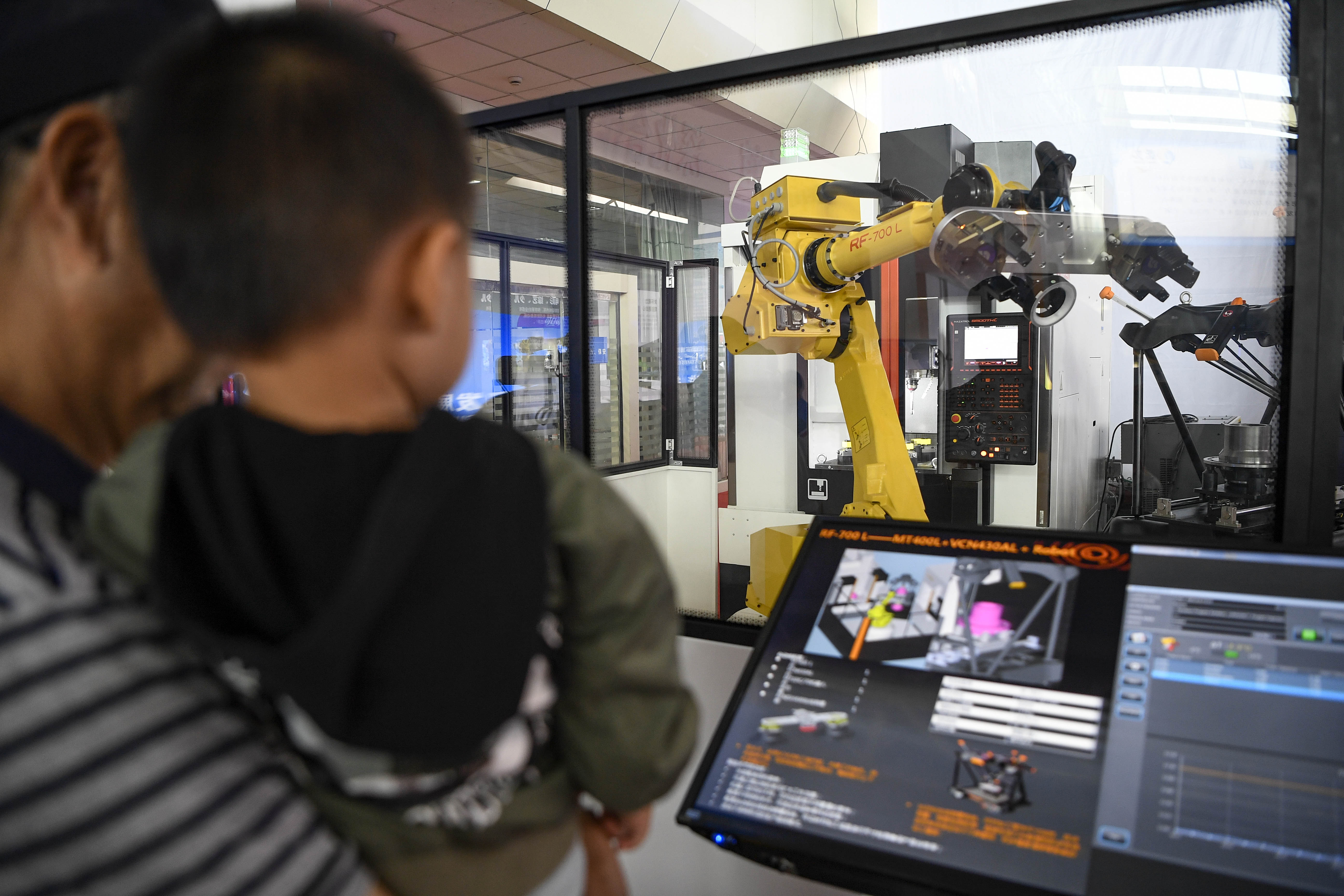 Visitors watch an engineer robot doing its work at the Expo, Sept. 6, 2019. (Xinhua/Feng Kaihua)