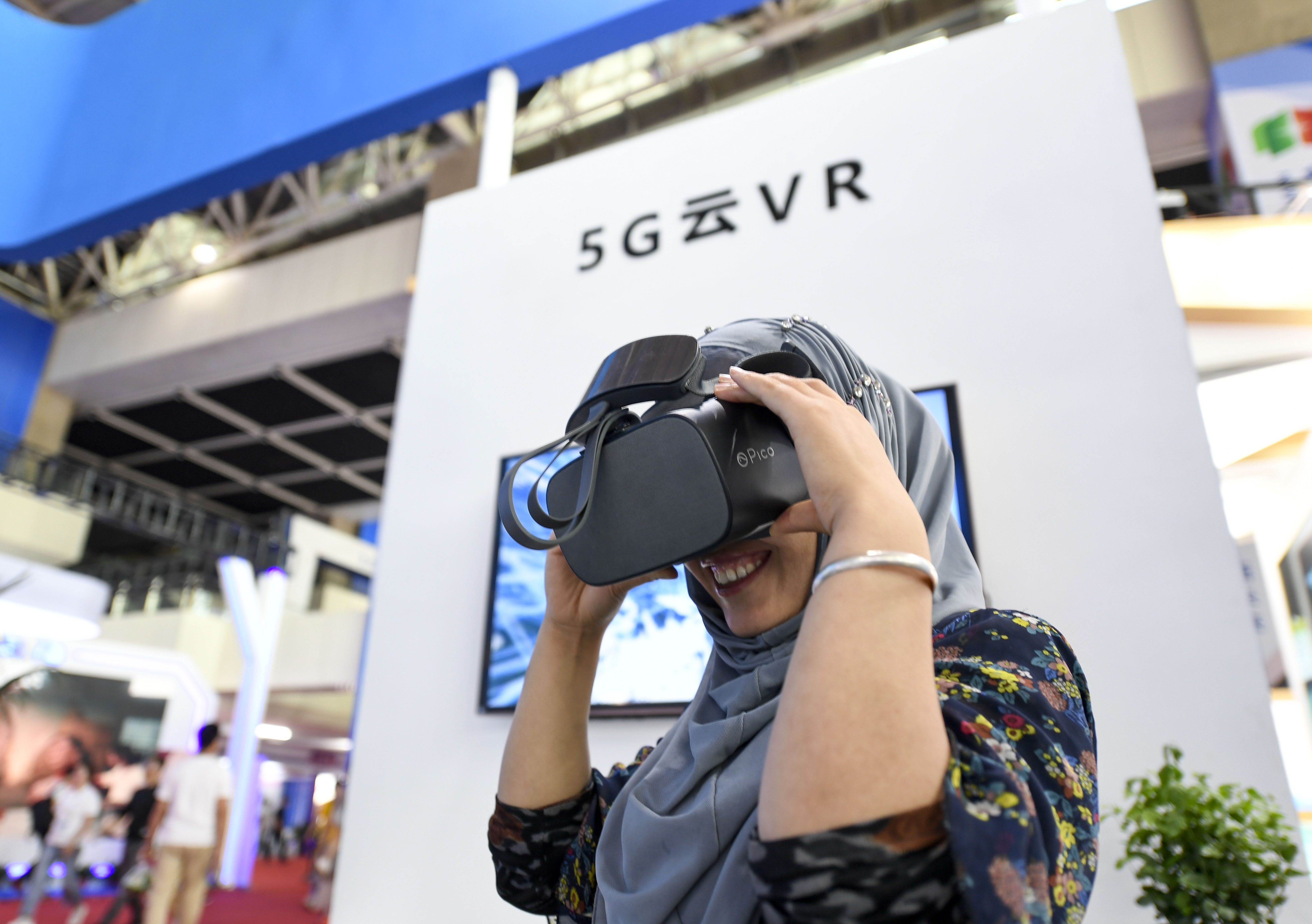 A visitor tries on a 5G cloud-based virtual reality (VR) device at the Expo, Sept. 6, 2019. (Xinhua/Feng Kaihua)