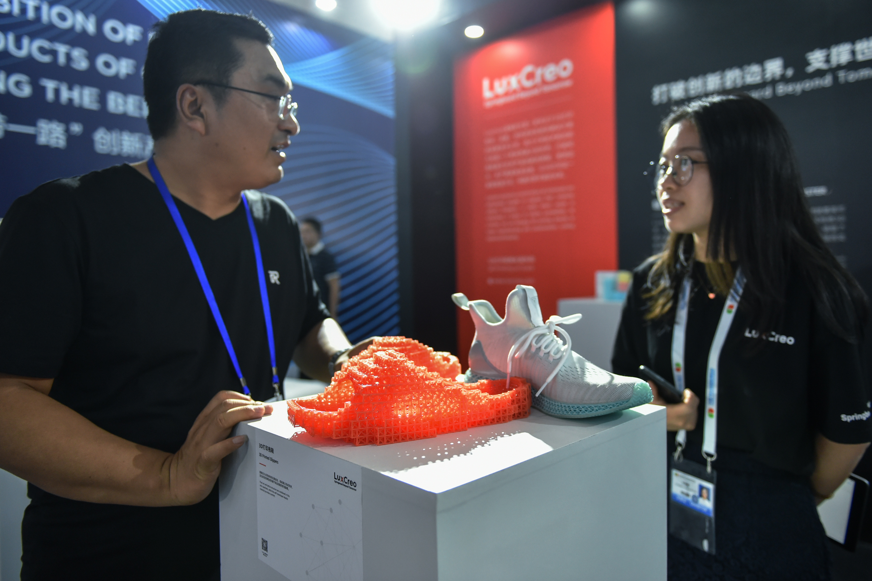 An exhibitor (R) shows footwear products made with a rapid 3D printing technology at the Expo, Sept. 5, 2019. (Xinhua/Li Mangmang)