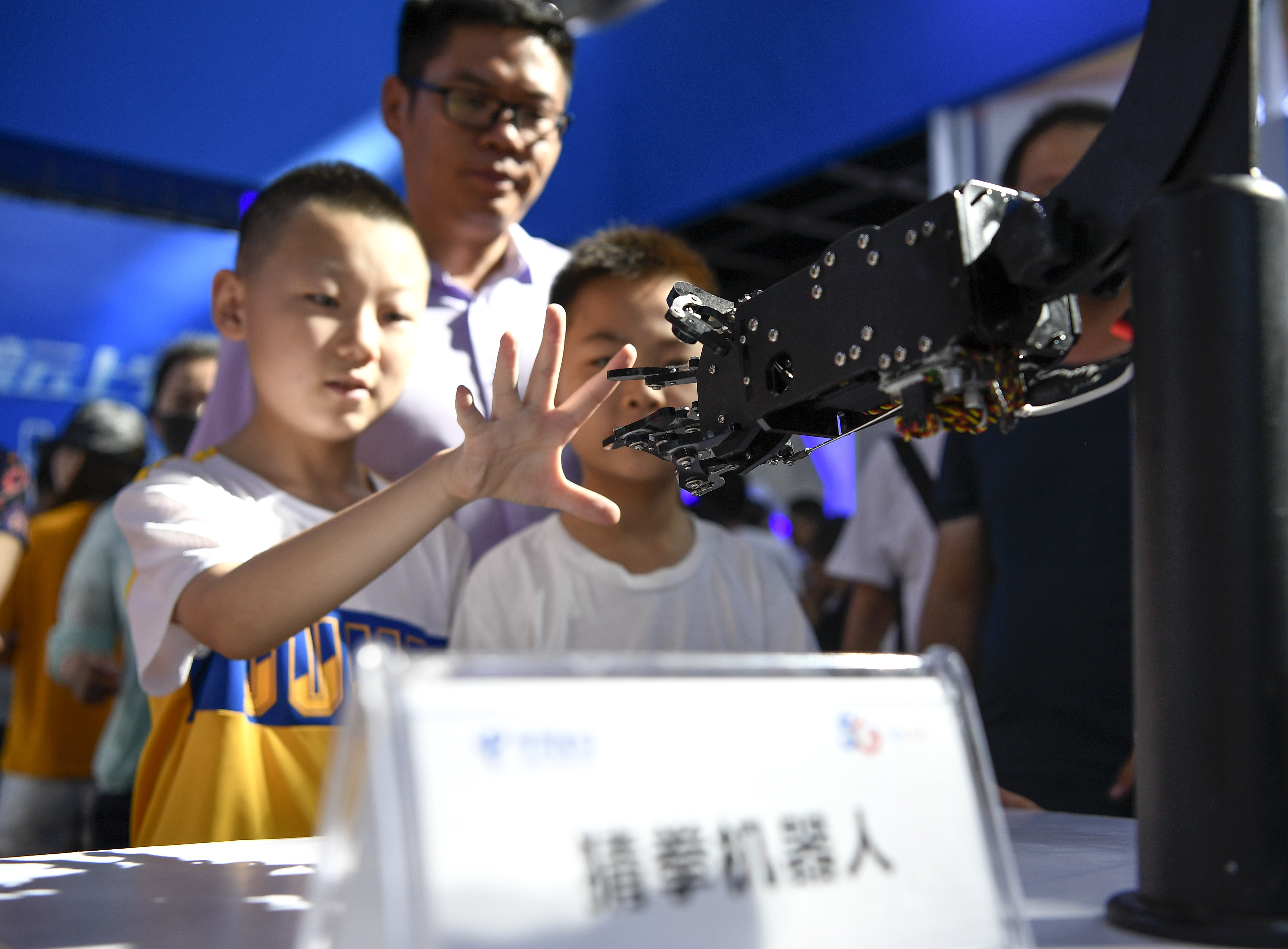 A boy plays finger-guessing game with a robot at the Expo, Sept. 7, 2019. (Xinhua/Feng Kaihua)