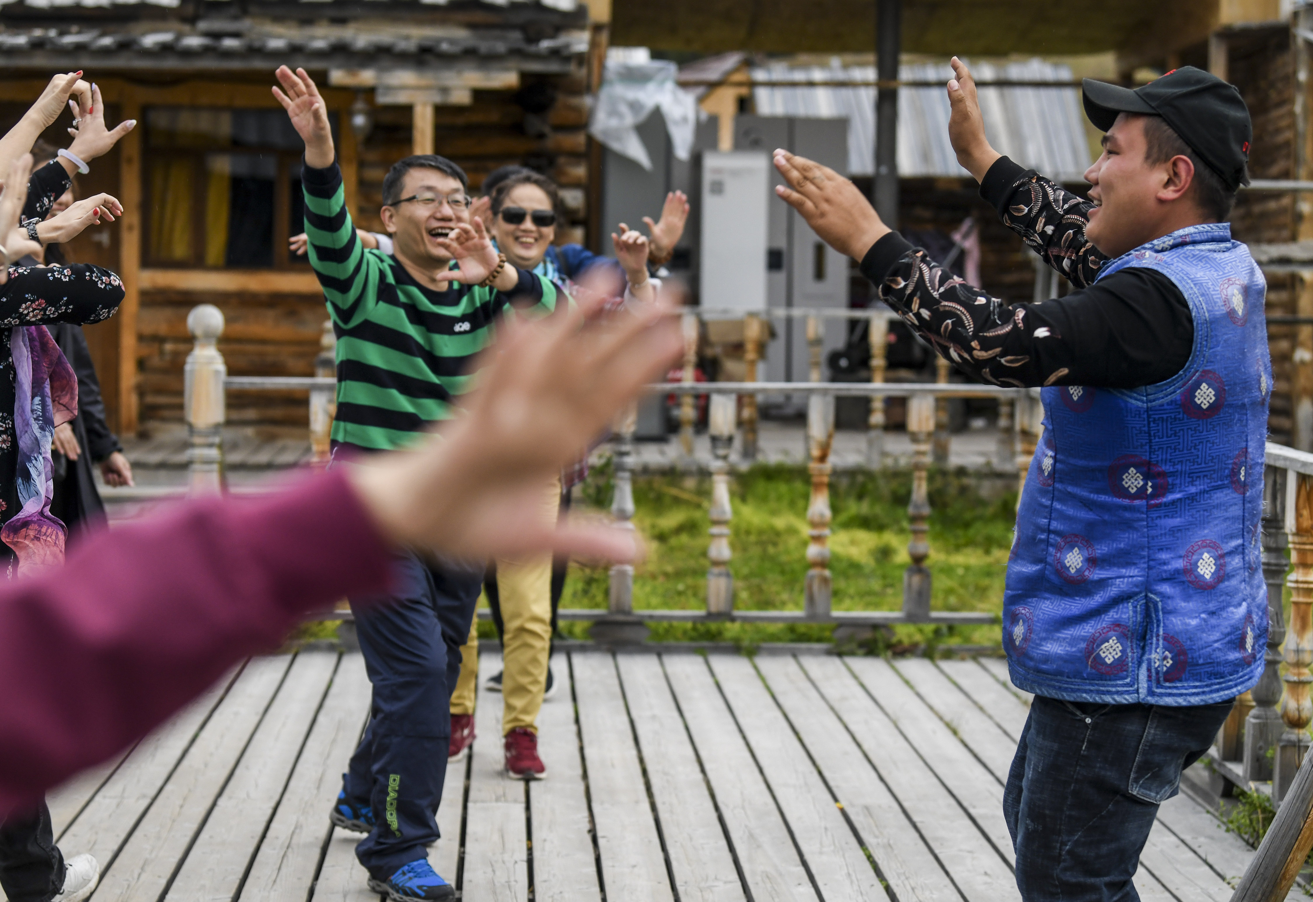 Tourists dance with a local man at a homestay in Kanas scenic spot in Altay, northwest China's Xinjiang Uygur Autonomous Region, Sept. 23, 2019. (Xinhua/Wang Fei)