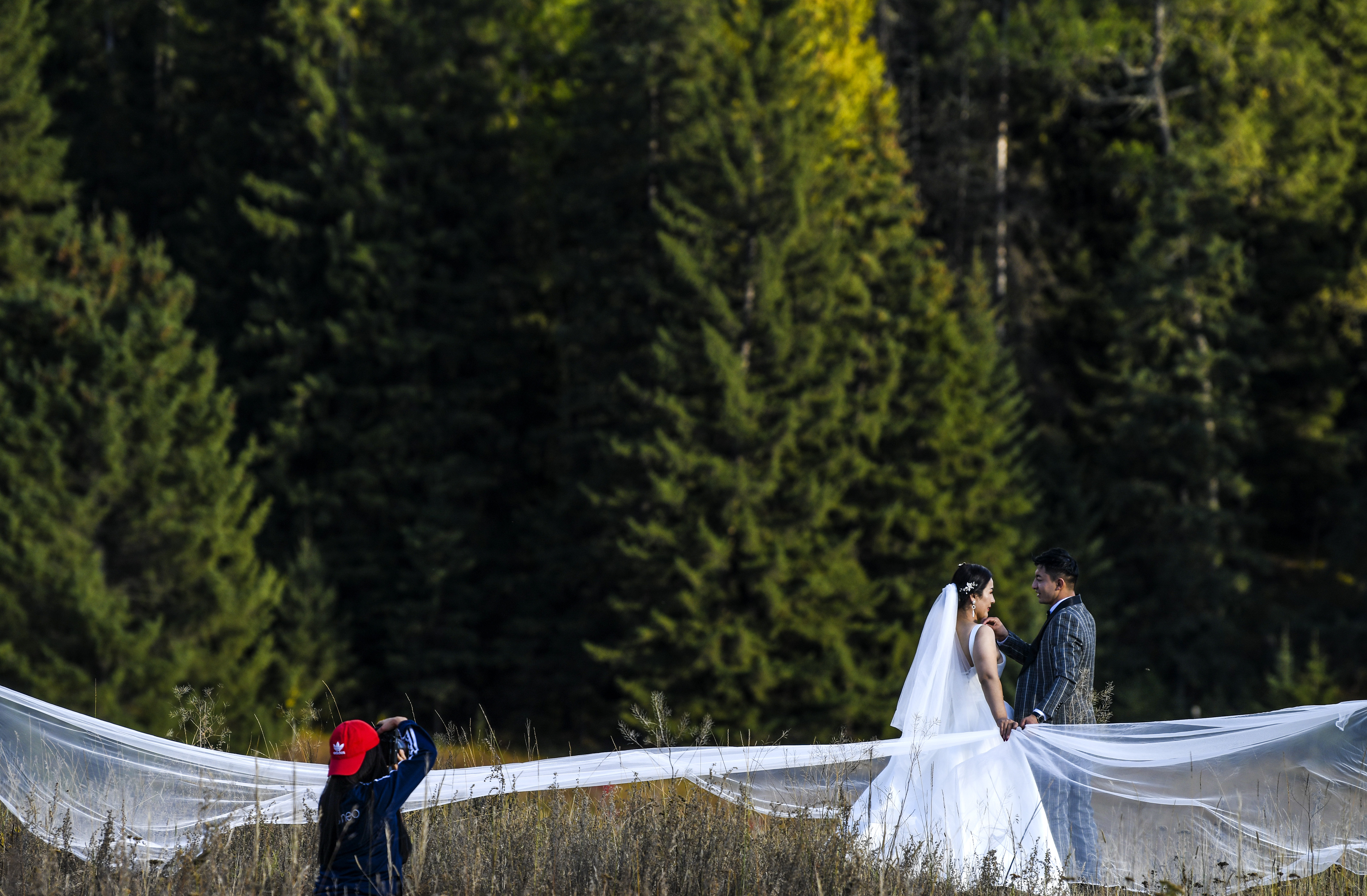 A newly-wed couple pose for photos at Kanas scenic spot in Altay, northwest China's Xinjiang Uygur Autonomous Region, Sept. 25, 2019. (Xinhua/Wang Fei)