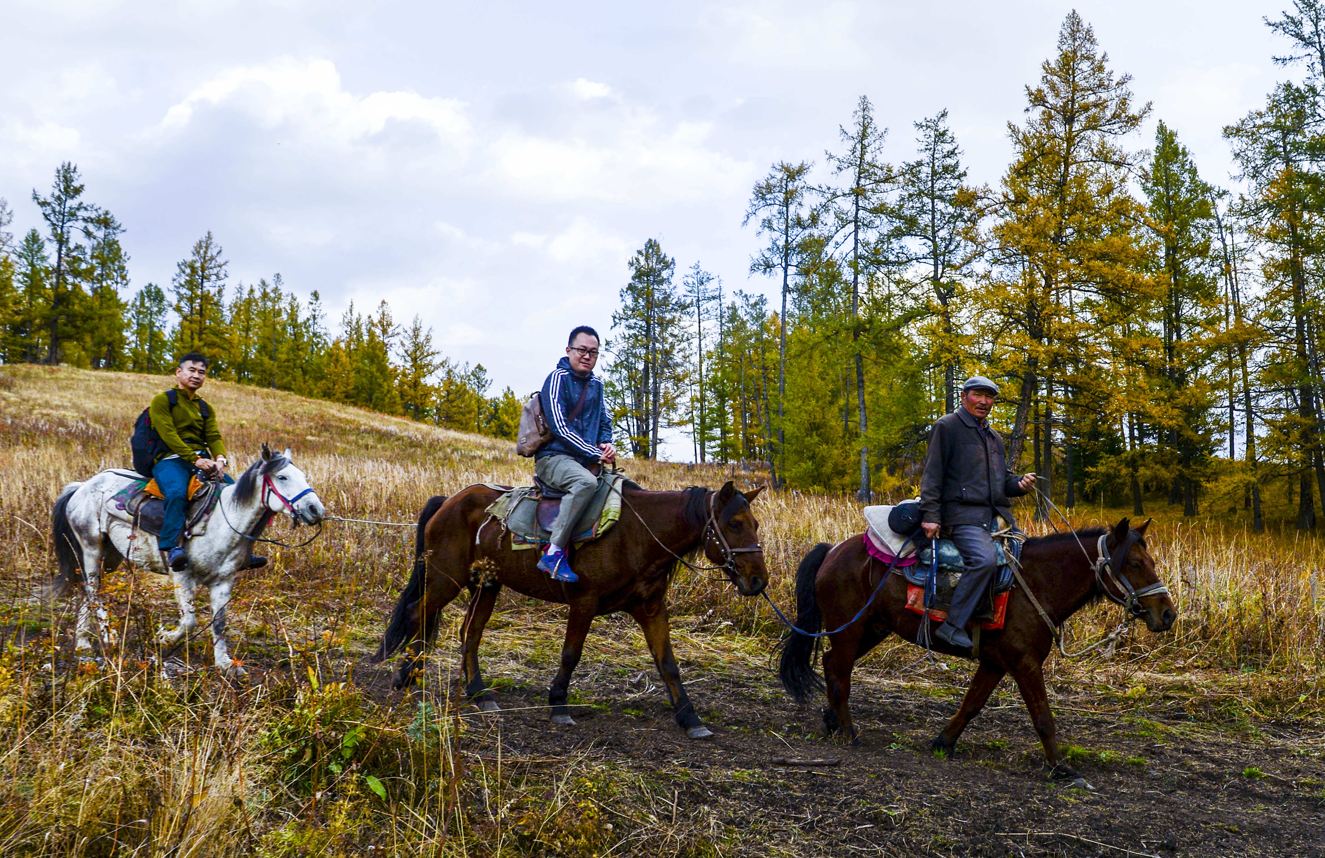 Tourists ride horses with the guide of a local herdsman at Kanas scenic spot in Altay, northwest China's Xinjiang Uygur Autonomous Region, Sept. 24, 2019. (Xinhua/Ma Kai)