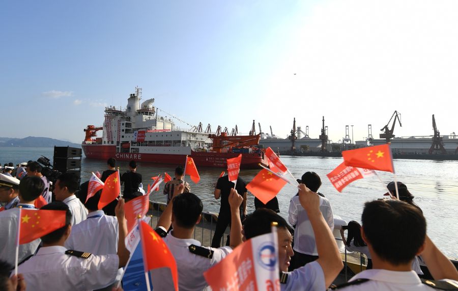 People wave goodbye as the China's polar icebreaker Xuelong 2, departs from the Shekou cruise home port in Shenzhen, south China's Guangdong Province, Oct. 15, 2019. (Xinhua/Mao Siqian)