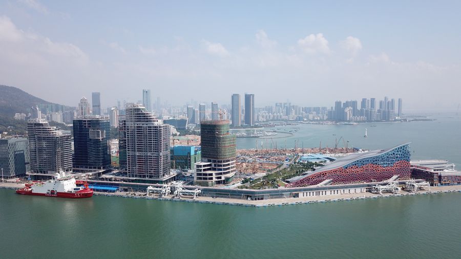 Aerial photo taken on Oct. 15, 2019 shows China's polar icebreaker Xuelong 2, that is to depart at the Shekou cruise home port in Shenzhen, south China's Guangdong Province. (Xinhua/Mao Siqian)