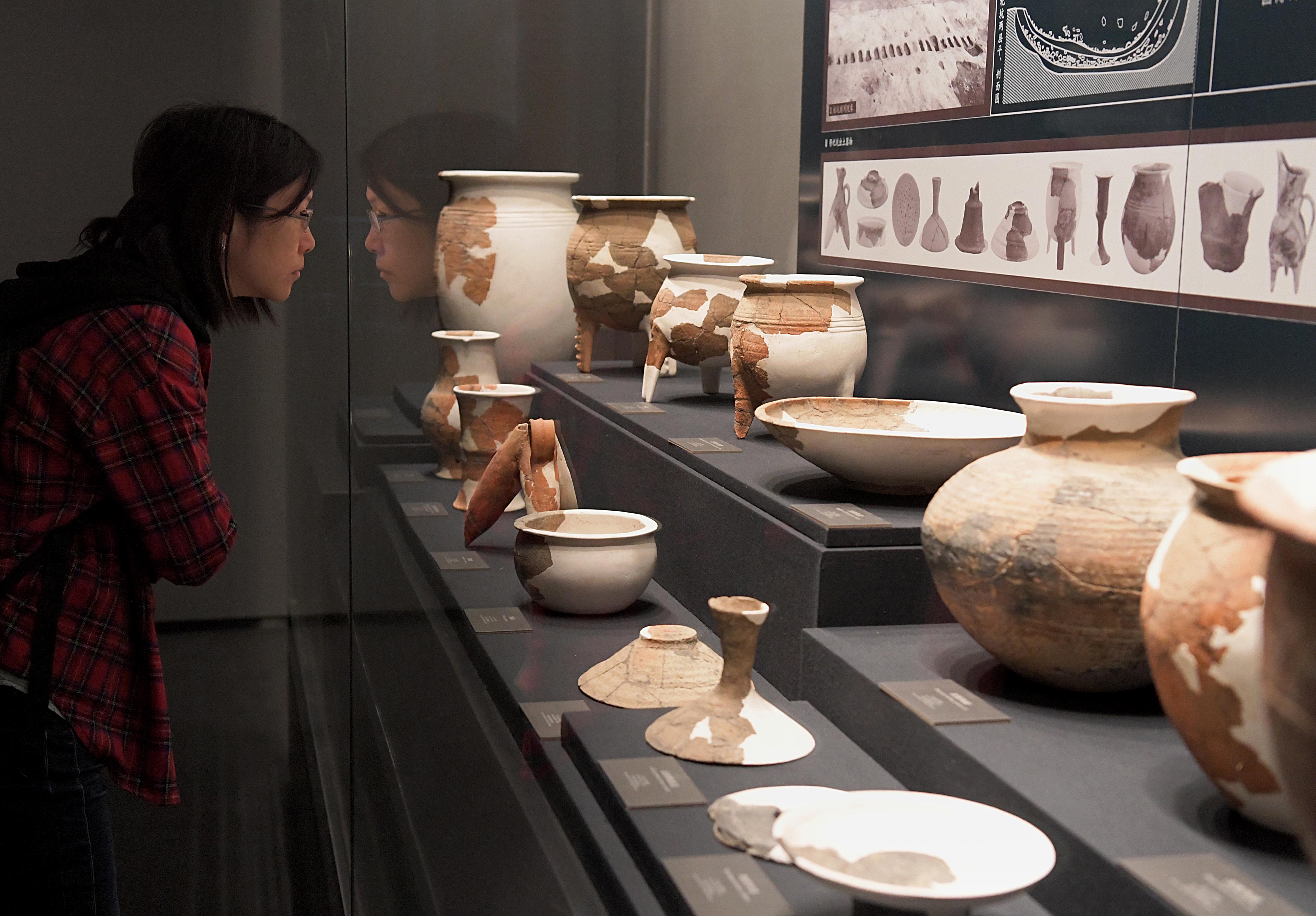 A visitor views pottery ware exhibits at the Erlitou Relic Museum in Luoyang, central China's Henan Province, Oct. 19, 2019. (Xinhua/Li An)