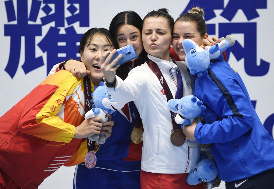 Gold medalist Iana Egorian of Russia (2nd L), silver medalist Qian Jiarui of China (1st L) and bronze medalists Alina Komashchuk of Ukraine (1st R) and Malgorzata Kozaczuk of Poland take selfies during the awarding ceremony of women's individual sabre final at the 7th International Military Sports Council (CISM) Military World Games in Wuhan, capital of central China's Hubei Province, Oct. 20, 2019. (Xinhua/Wang Peng)