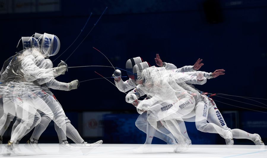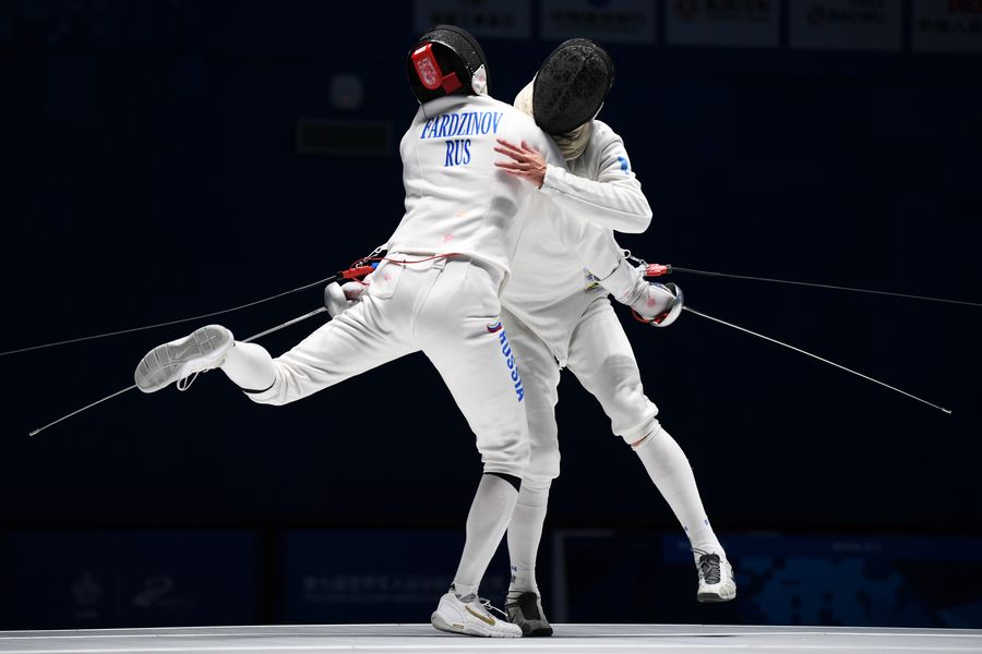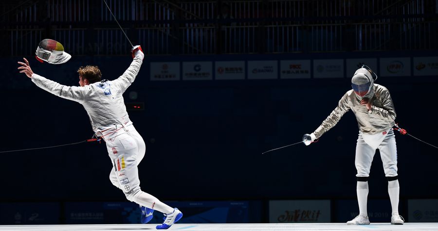 Timur Safin (R) of Russia competes with Maxime Pauty of France during the men's Individual Foil gold medal bout at the 7th International Military Sports Council (CISM) Military World Games in Wuhan, capital of central China's Hubei Province, Oct. 19, 2019. Timur Safin won the gold medal. (Xinhua/Wang Jianwei)