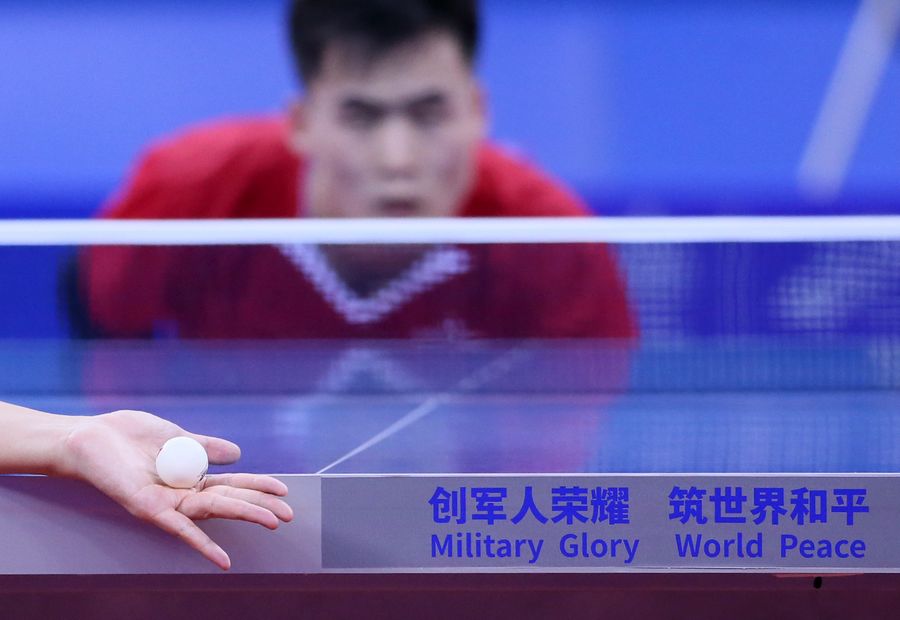 Xu Chenhao of China prepares to serve the ball during a match with Ro Hyon Song of the Democratic People's Republic of Korea (DPRK) at Men's team group A preliminary round between team China and team DPRK at the 7th International Military Sports Council (CISM) Military World Games in Wuhan, capital of central China's Hubei Province, Oct. 19, 2019.(Xinhua/Hou Jun)
