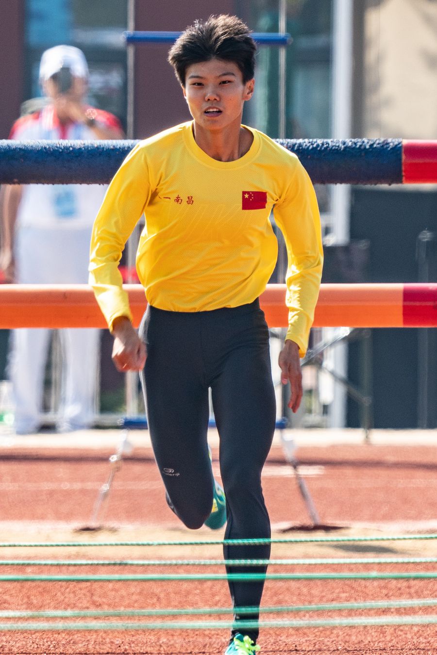 Lu Pinpin of China competes during the women's individual obstacle run of the military pentathlon at the 7th CISM Military World Games in Wuhan, capital of central China's Hubei Province, Oct. 20, 2019. Lu broke the world record of the women's individual obstacle run with 2:10.9. (Xinhua/Liu Jinhai)