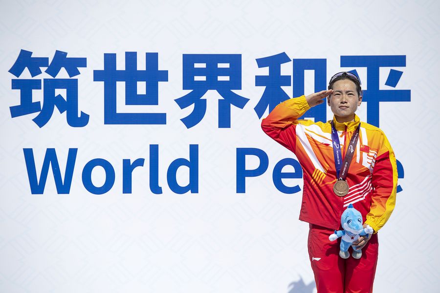Liang Hongyu of China attends the awarding ceremony of the women's individual time trial final of the cycling road at the 7th CISM Military World Games in Wuhan, capital of central China's Hubei Province, Oct. 19, 2019. Liang won the bronze medal of the event. (Xinhua/Xiong Qi)