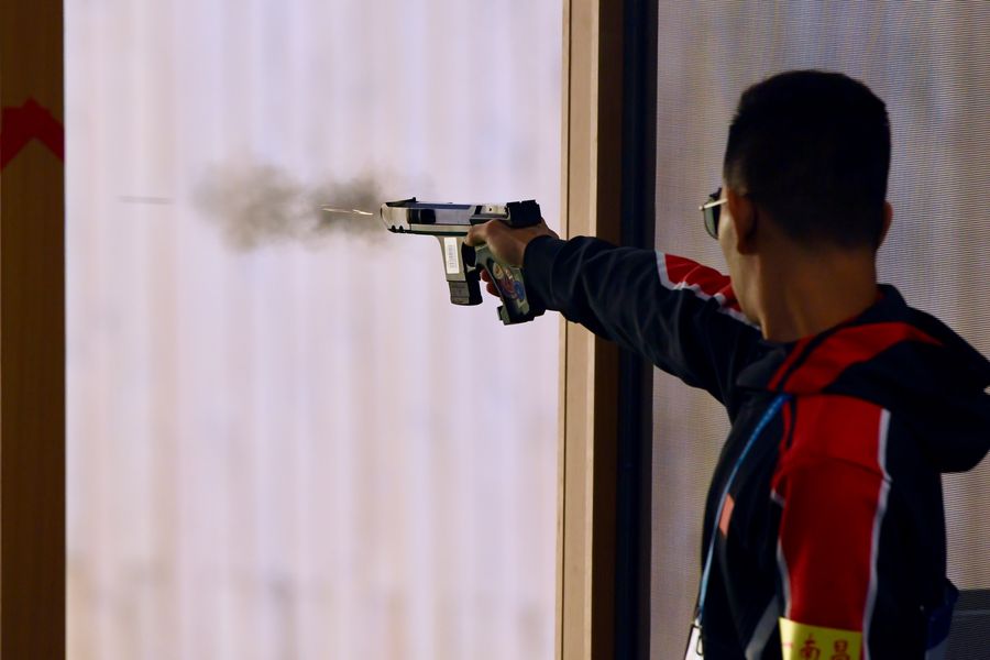 Gao Zheng of China competes during the team competition of the Men's 25m Military Rapid Fire Pistol of the 7th CISM Military World Games in Wuhan, capital of central China's Hubei Province, Oct. 19, 2019. China won the competition.(Xinhua/Jiang Kehong)