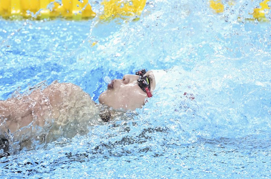 Chen Jie of China competes during the women's 4X100m medley relay at the 7th International Military Sports Council (CISM) Military World Games in Wuhan, capital of central China's Hubei Province, Oct. 19, 2019. China secured the victory in women's 4X100m medley relay in 4:00.16 on Saturday. (Xinhua/Cheng Min)