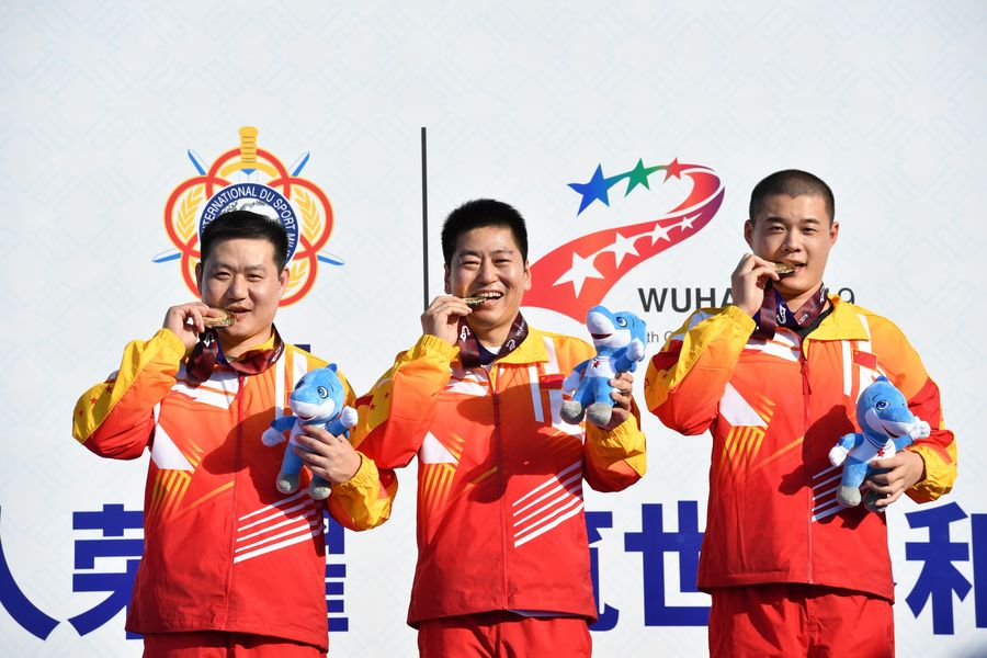 Jin Yongde (C), Xie Zhenxiang (L) and Yao Zhaonan of China bite gold medals during the awarding ceremony of the 25M military rapid fire pistol men's team event at the 7th International Military Sports Council (CISM) Military World Games in Wuhan, capital of central China's Hubei Province, Oct. 19, 2019. China won tournament's first gold at 7th Military World Games from the event on Saturday. (Xinhua/Jiang Kehong)