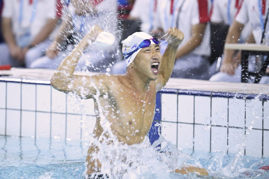 Zhang Zheng celebrates after winning the men's individual obstacle swimming gold medal in a world record-tying 23.8 seconds at the 7th CISM Military World Games in Wuhan, capital of central China's Hubei Province, Oct. 21, 2019. (Xinhua/Fan Peishen)■