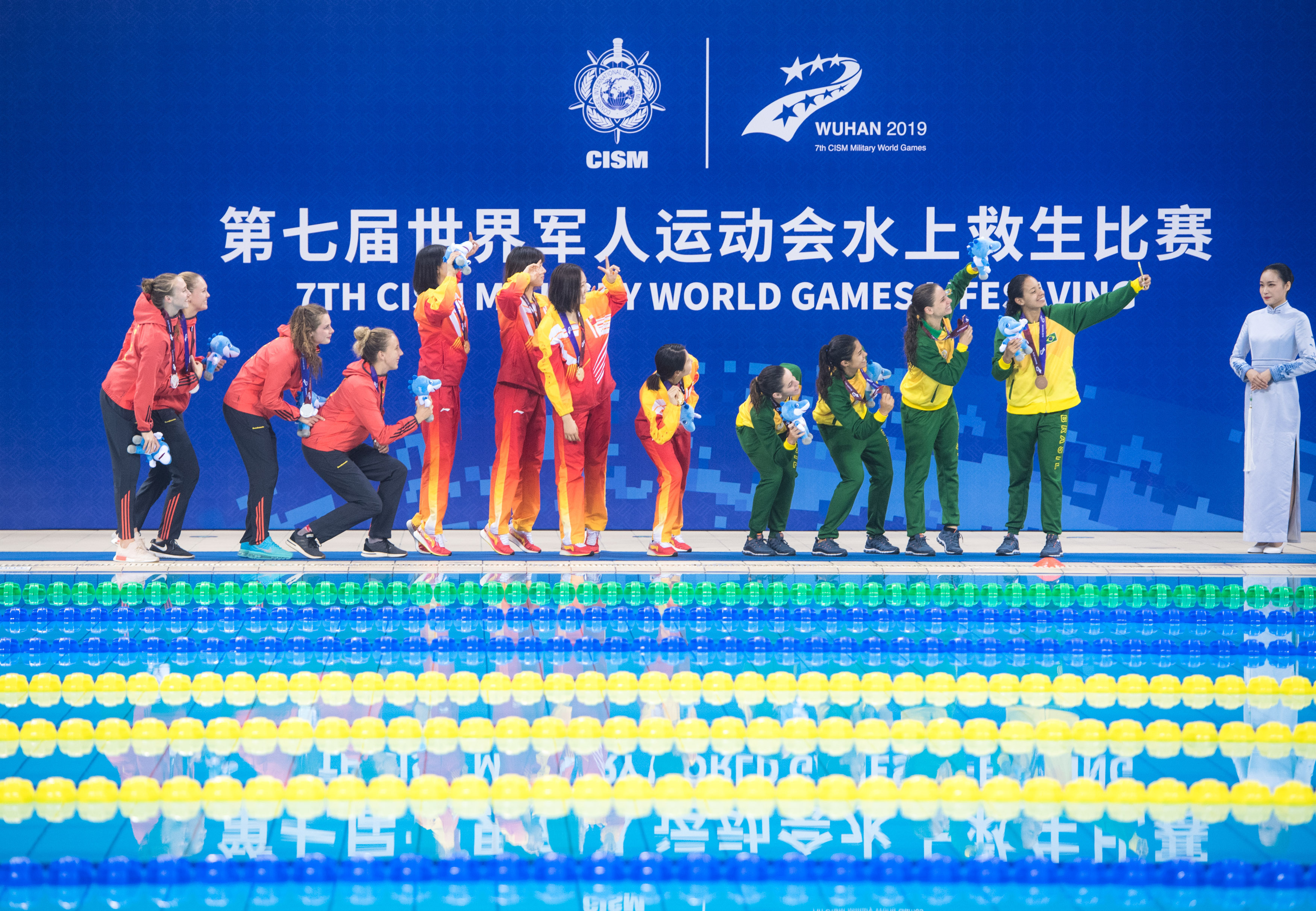 Gold medalist team China, silver medalist team Germany and bronze medalist team Brazil take a selfie after the awarding ceremony of women's 4x25m manikin relay of lifesaving at the 7th CISM Military World Games in Wuhan, capital of central China's Hubei Province, Oct. 21, 2019. (Xinhua/Xiao Yijiu)
