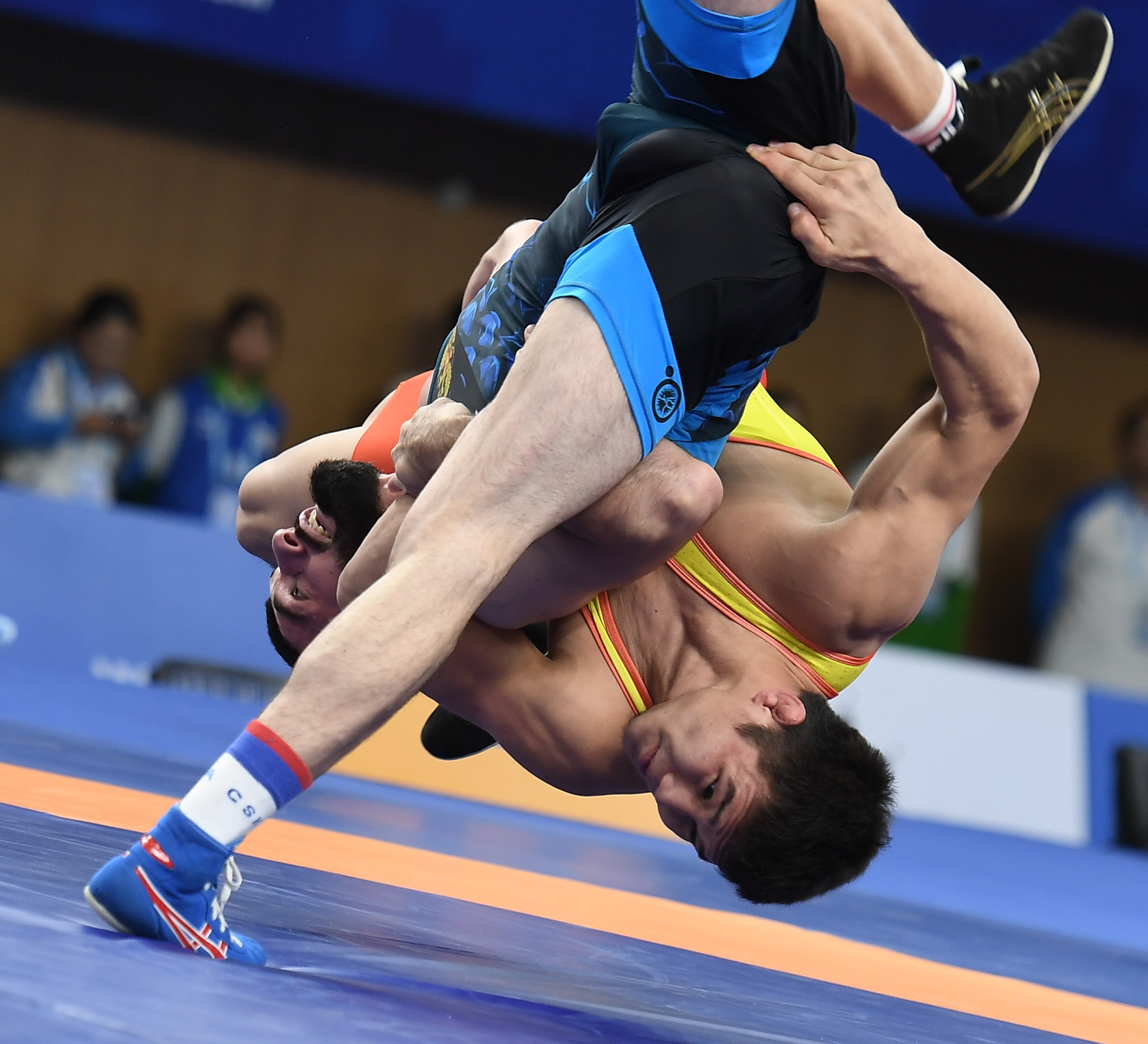 Khetik Tsabolov (L) of Russia competes with Nurkozha Kaipanov of Kazakhstan during the men's freestyle 74kg of wrestling at the 7th CISM Military World Games in Wuhan, capital of central China's Hubei Province, Oct. 21, 2019.(Xinhua/Li He)