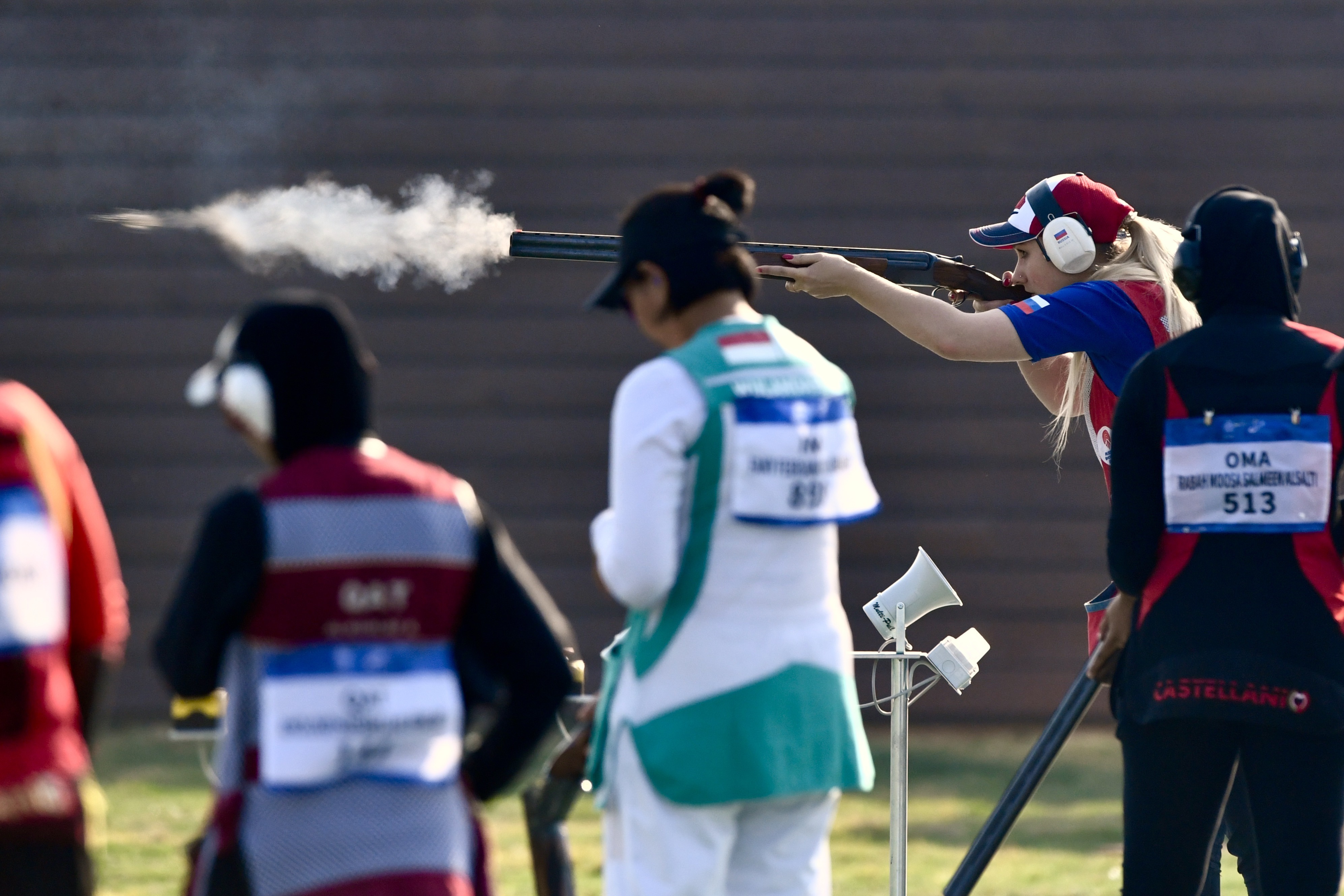 Iuliia Tugolukova of Russia competes during the women's individual shotgun trap qualification of shooting at the 7th International Military Sports Council (CISM) Military World Games in Wuhan, capital of central China's Hubei Province, Oct. 21, 2019. (Xinhua/Jiang Kehong)