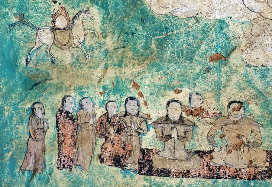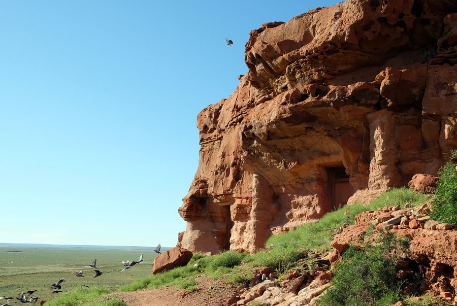 The grottoes, home to nearly 1,000 frescoes related to Tibetan Buddhism, are located on a hill in the grasslands of Otog Banner, Ordos City, along with other ancient structures including temples and palaces.