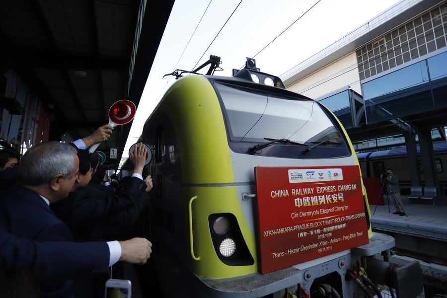 Officials and representatives attend the welcoming ceremony for the first China Railway Express freight train at the Ankara train station in Ankara, Turkey, Nov. 6, 2019. (Photo by Mustafa Kaya/Xinhua)