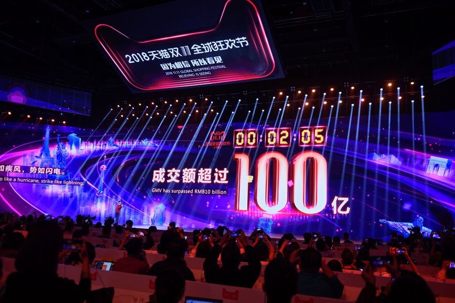 A giant screen displays sales on Alibaba's online marketplace Tmall for Singles' Day shopping spree in Shanghai, east China, Nov. 11, 2018. (Xinhua/Huang Zongzhi)