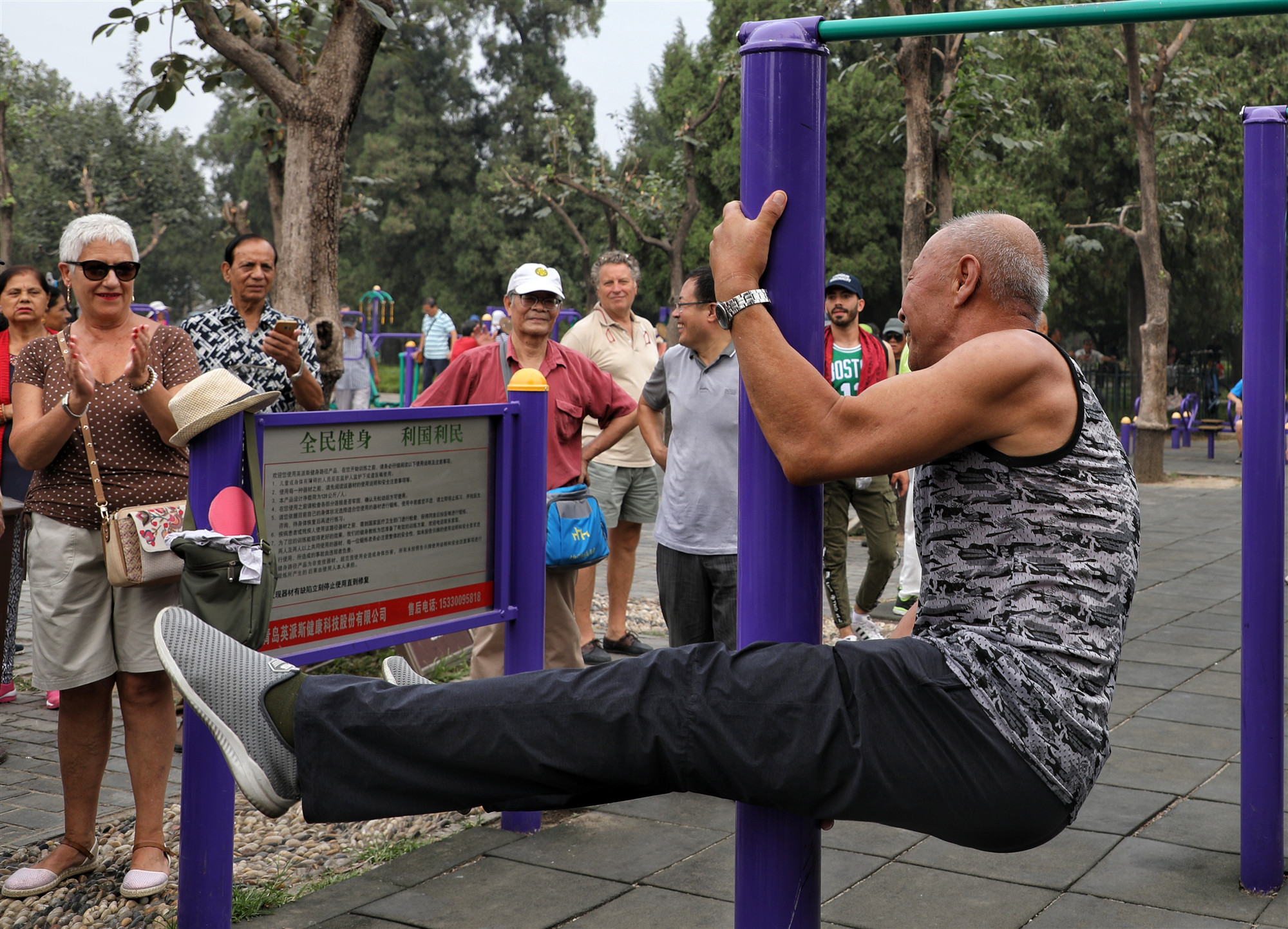 A group of athletic silver-haired men turn the centuries-old Temple of Heaven in Beijing into a vibrant world when they stand on head, swing around the high bar or practice Taiji.