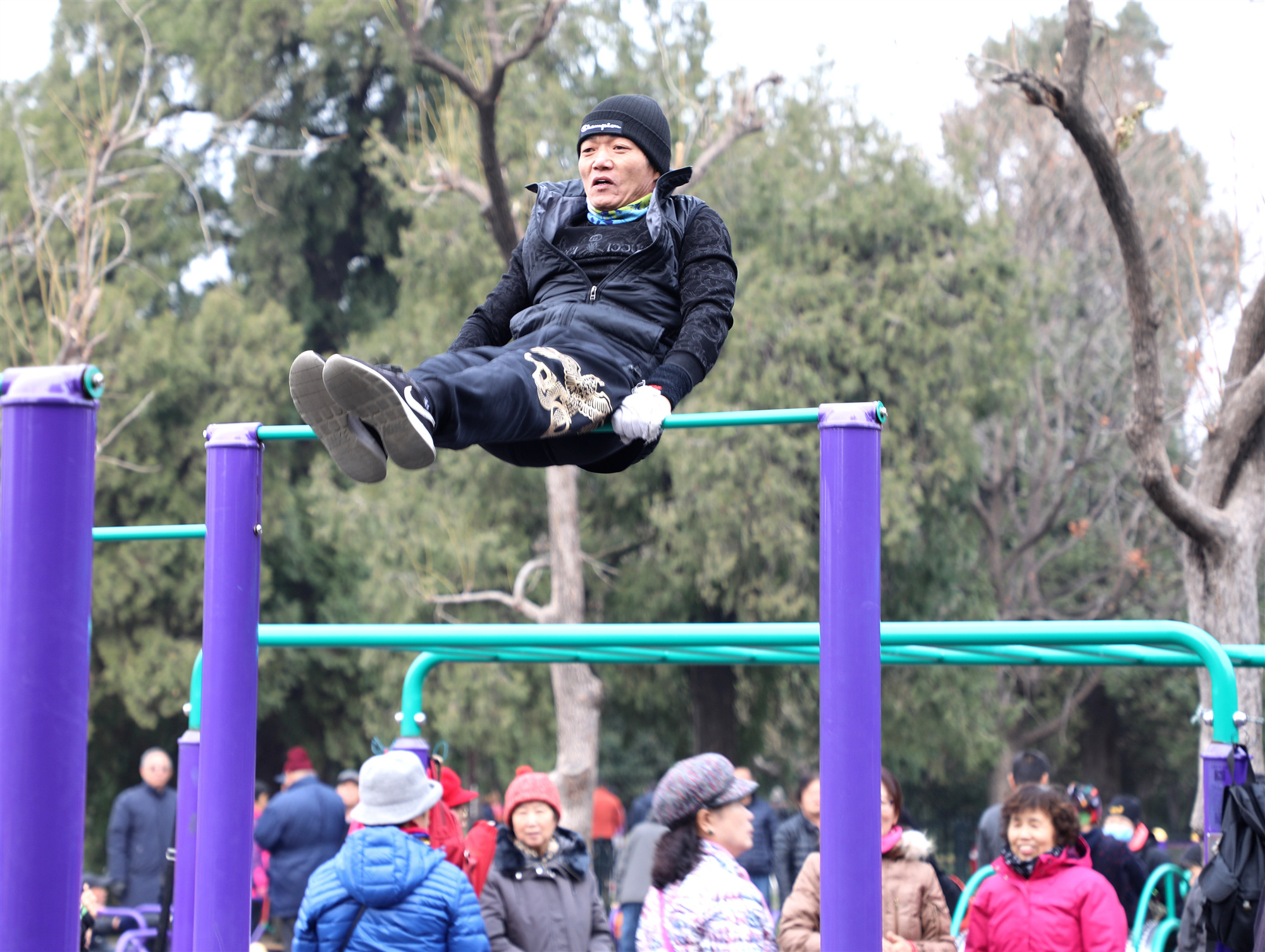 He has been practicing on the high bar for three or four years, but didn't get it for the giant swing until this year. "But at the Temple of Heaven, you don't have to worry about where to learn the skills as there are always masters here from whom you can learn," the man says.