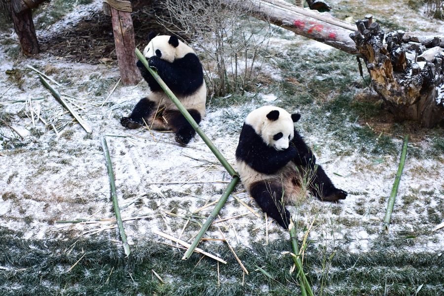 Two giant pandas eat bamboo during a snowfall at the panda house in the Qinghai-Tibet Plateau Wild Zoo in Xining, capital of northwest China's Qinghai Province, Nov. 29, 2019. Heating facilities will be used at the panda house of the wild zoo when the temperature is lower than minus 5 degrees Celsius in winter. (Xinhua/Wu Gang)