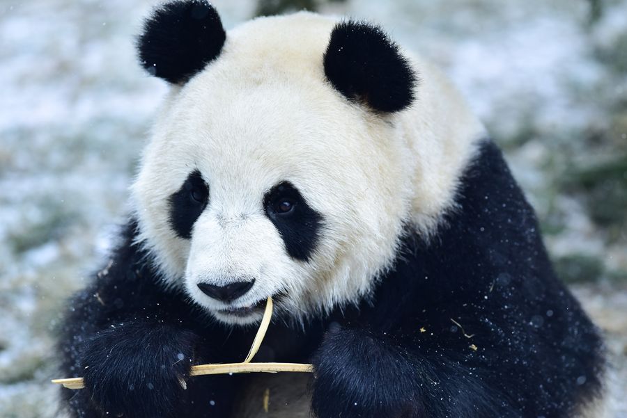 A giant panda eats bamboo during a snowfall at the panda house in the Qinghai-Tibet Plateau Wild Zoo in Xining, capital of northwest China's Qinghai Province, Nov. 29, 2019. Heating facilities will be used at the panda house of the wild zoo when the temperature is lower than minus 5 degrees Celsius in winter. (Xinhua/Wu Gang)