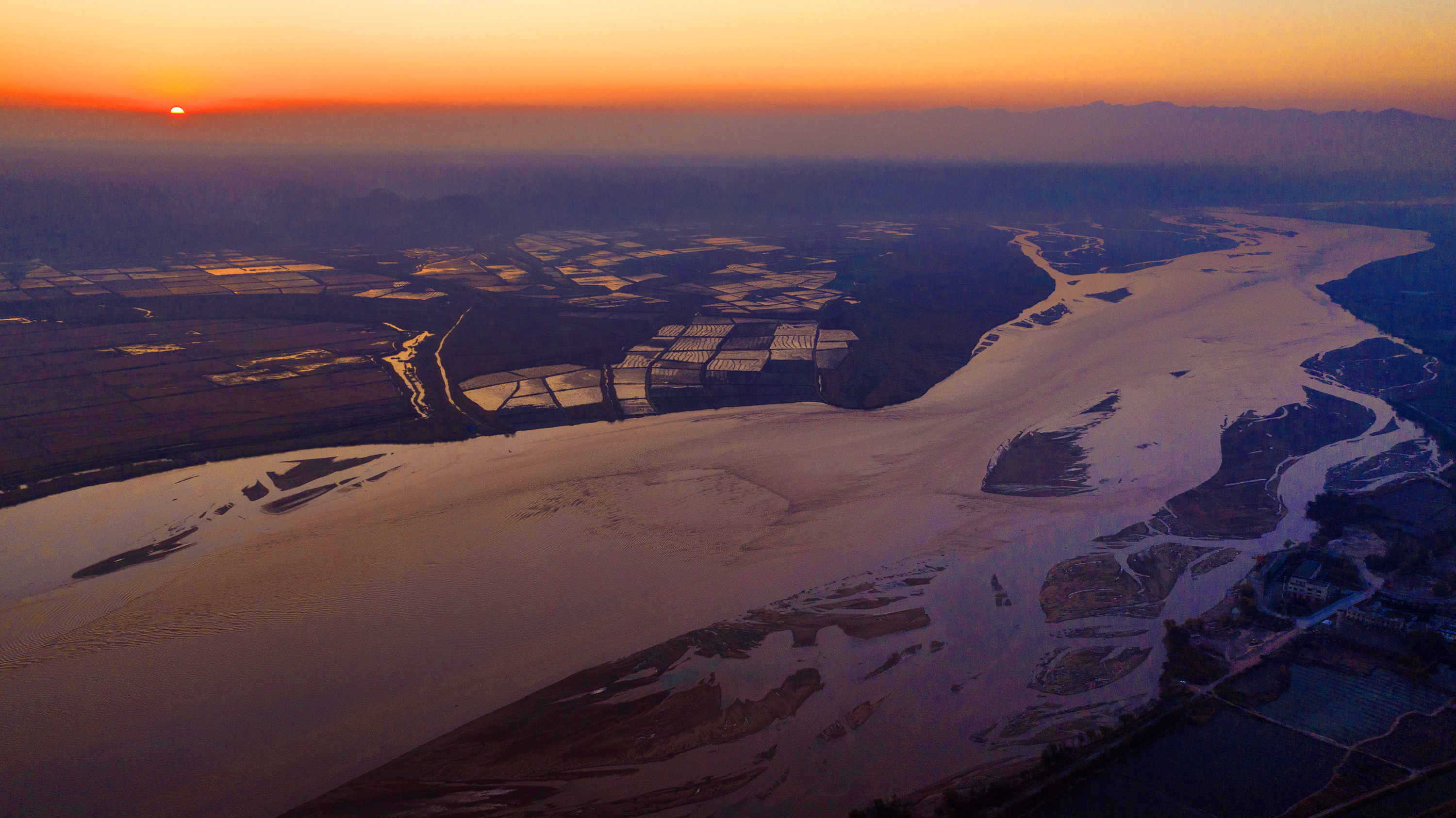 Aerial photo taken on Dec. 4, 2019 shows the sunrise scenery in the Heyang section of the Yellow River in northwest China's Shaanxi Province. (Xinhua/Tao Ming)