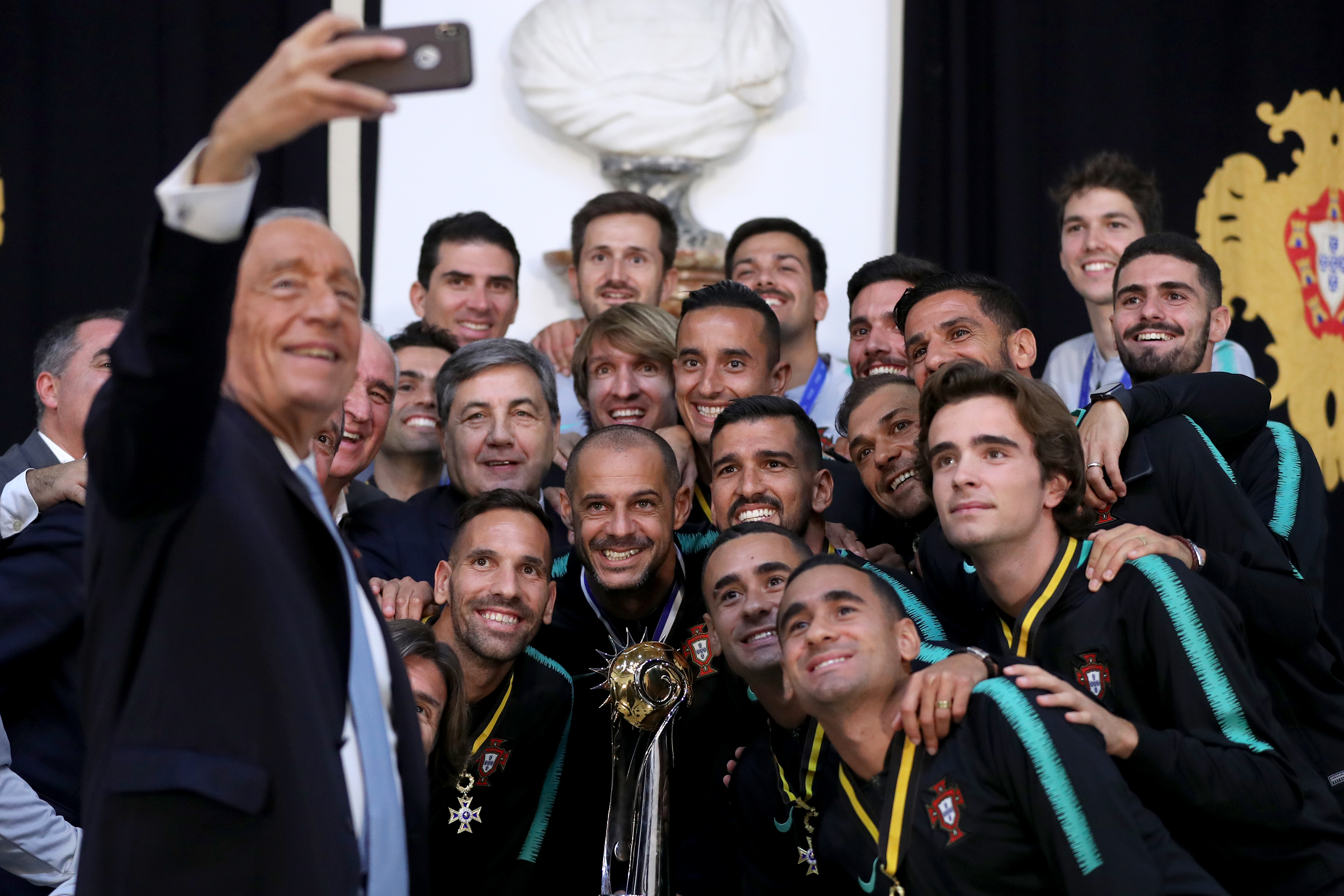 Portuguese President Marcelo Rebelo de Sousa takes a selfie with the players and the trophy of Beach Soccer World Cup after he awarded Portugal's national beach soccer team at the Belem Palace in Lisbon, Portugal, on Dec. 3, 2019. Portugal's national beach soccer team won the Champion of FIFA Beach Soccer World Cup, after beating Italy in the final. (Photo by Pedro Fiuza/Xinhua)