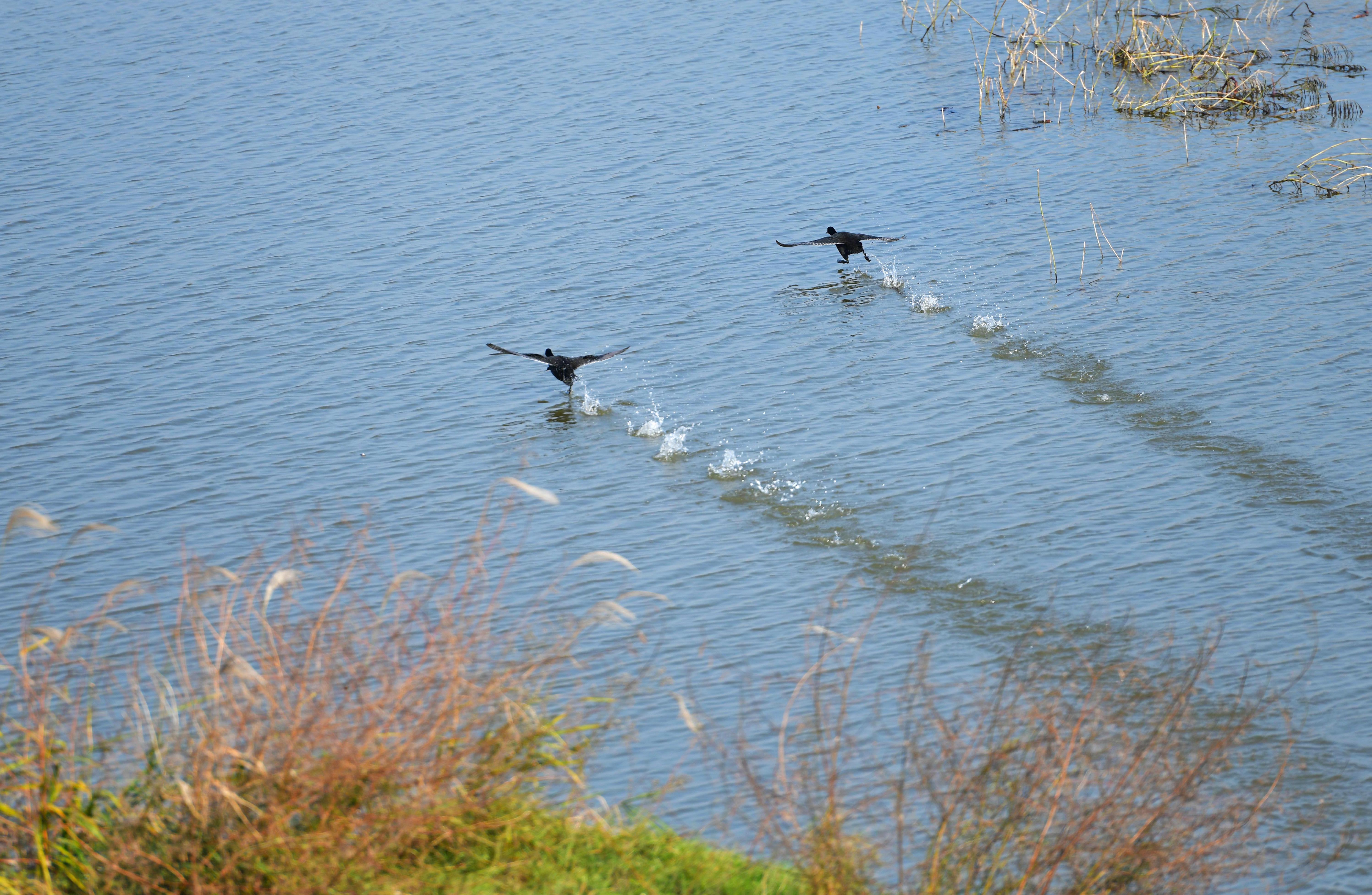 Two migrant birds fly at the Hengling Lake Provincial Nature Reserve, part of the Dongting Lake wetland, in Xiangyin County, central China's Hunan Province, Dec. 2, 2019. More than 50,000 migrant birds have arrived for spending the winter at the Hengling Lake area. (Photo by Guo Yudi/Xinhua)
