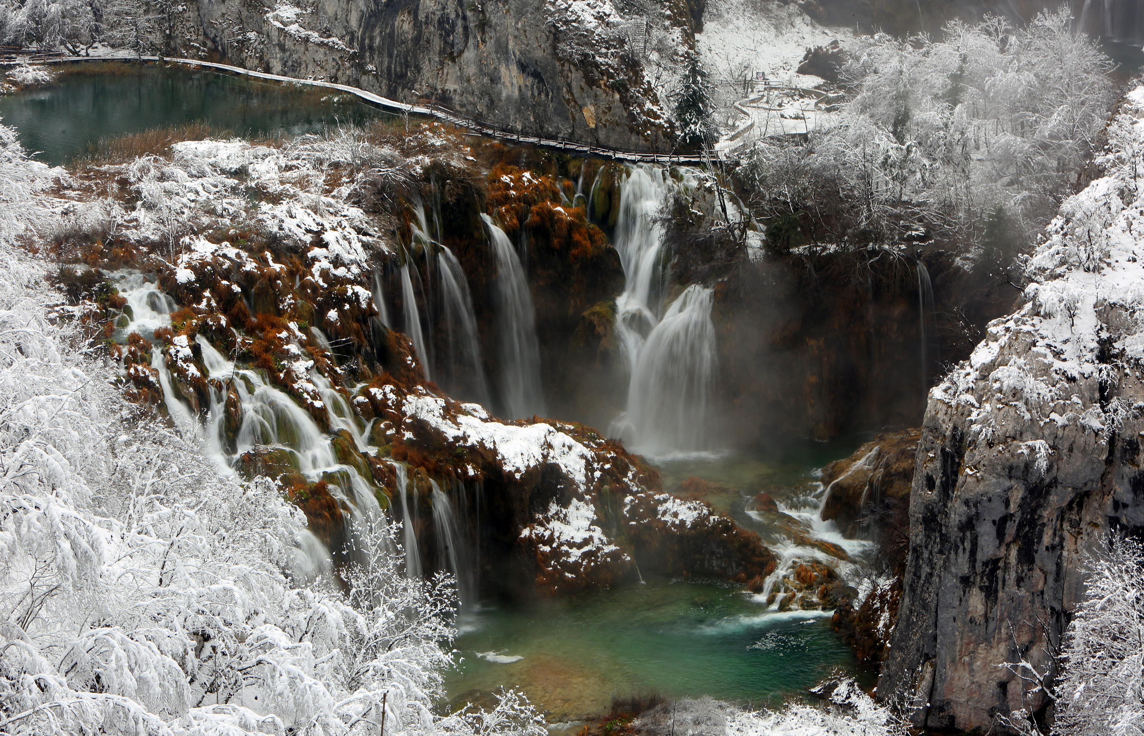 Photo taken on Dec. 4, 2019 shows a view of the snow-covered Plitvice Lakes National Park in Croatia. (Kristina Stedul Fabac/Pixsell via Xinhua)