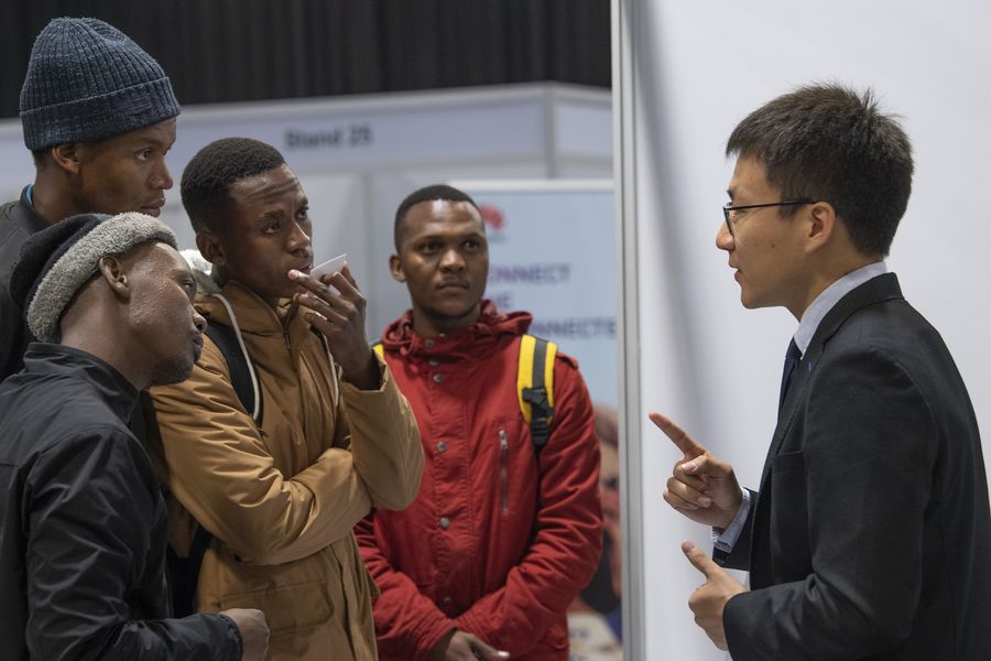 A staff member of a Chinese enterprise talks to job-seekers during a job fair in Johannesburg, South Africa, Dec. 10, 2019. (Xinhua/Chen Cheng)
