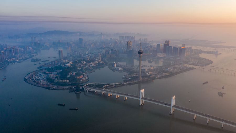 Looking out, Macao's modern high-rise skyline merged into the prosperous world-class city cluster of the Guangdong-Hong Kong-Macao Greater Bay Area.
