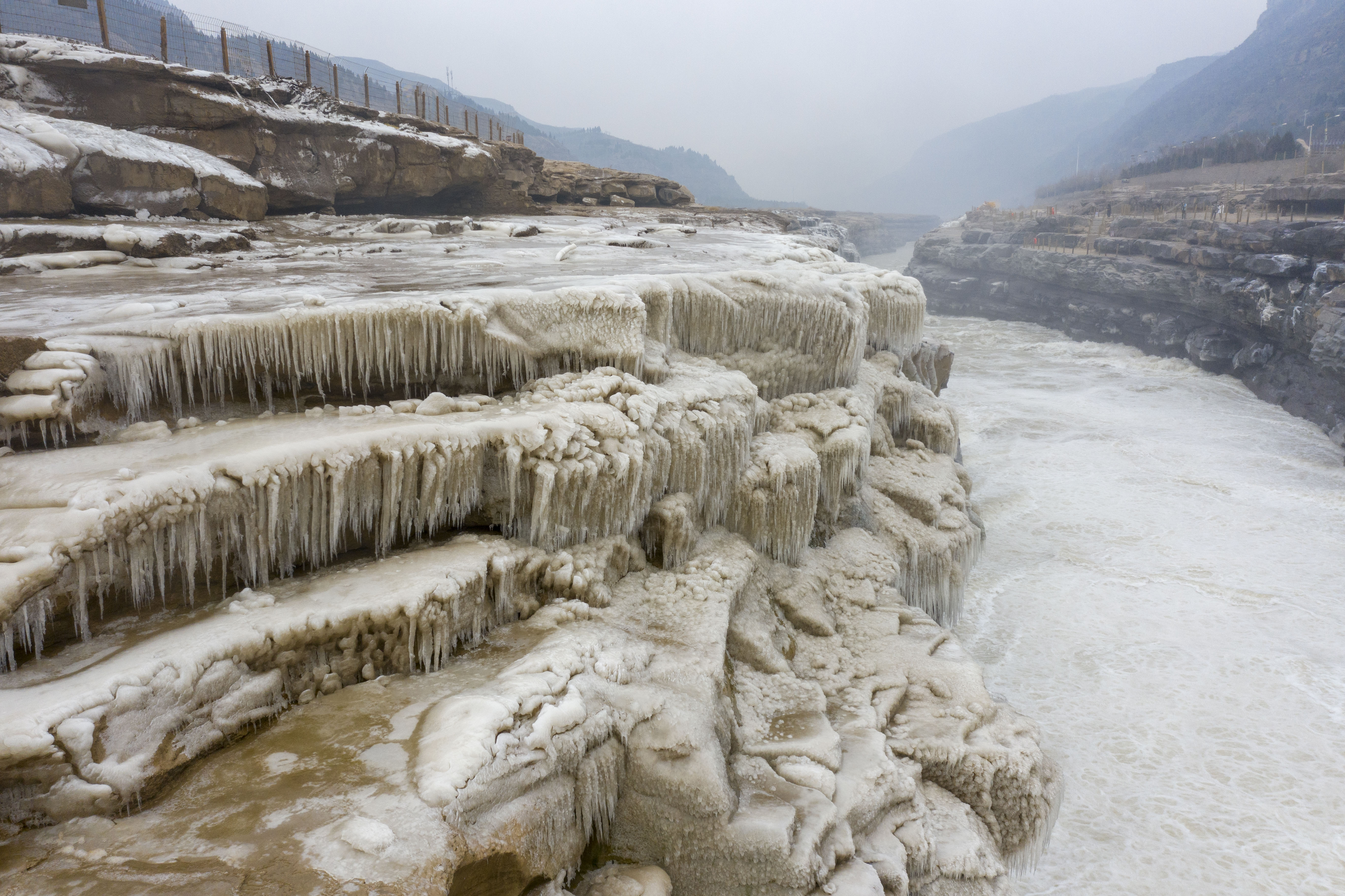 Aerial photo taken on Dec. 24, 2019 shows a view of the Hukou Waterfall scenic spot in Jixian, north China's Shanxi Province.(Xinhua/Yang Chenguang)