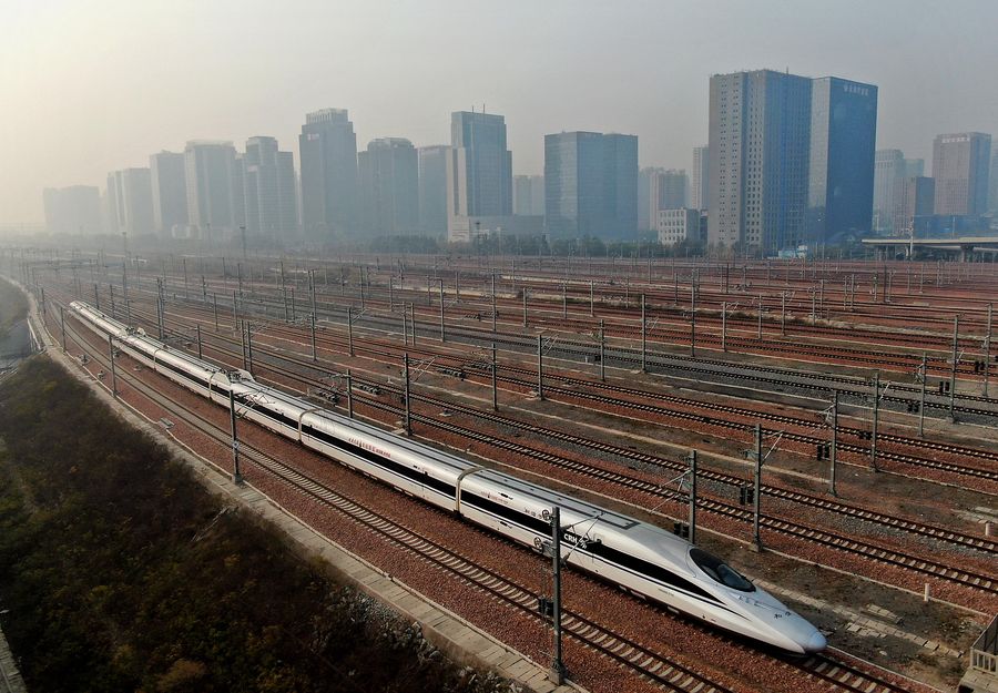 A bullet train running from Zhengzhou to Xiangyang is seen near the Zhengzhou East Railway Station in Zhengzhou, central China's Henan Province, Dec. 1, 2019. (Xinhua/Li An)