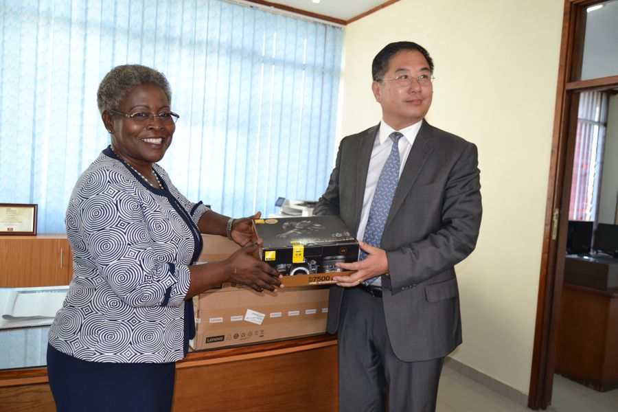 Chinese Ambassador to Malawi Liu Hongyang (R) presents a video camera to a Times Group official at their head office in Blantyre, Malawi, Dec. 20, 2019. (Xinhua/Kenneth Jali)