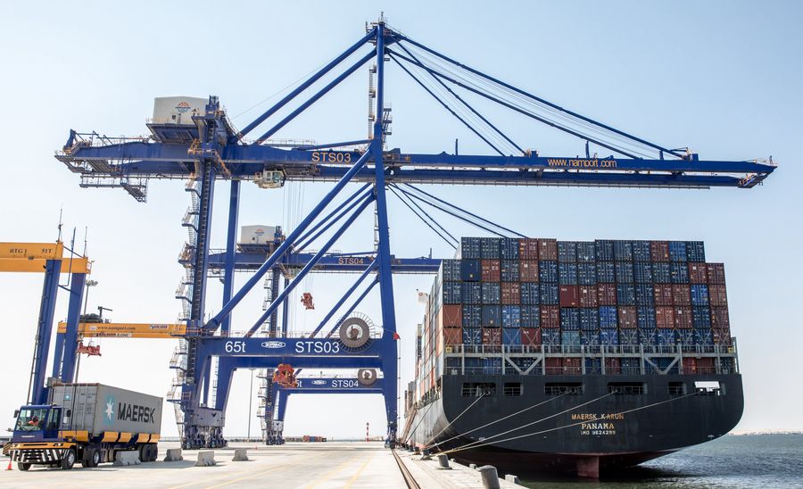 Containers are seen on a vessel at the new container terminal in Walvis Bay, Namibia, Aug. 2, 2019. (Xinhua/Zhang Yu)