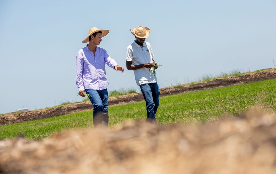 A Chinese agricultural expert (L) checks paddy fields with a local agricultural technician in Xaixai of Gaza, Mozambique, Nov. 28, 2019. (Xinhua/Zhang Yu)