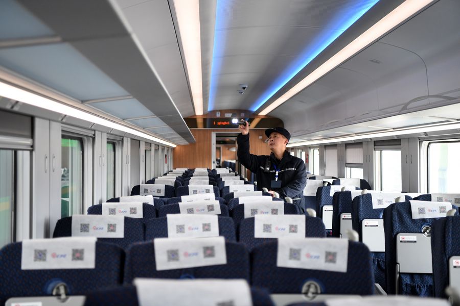 A railway worker conducts maintenance checks on a bullet train in southwest China's Chongqing Municipality, Jan. 7, 2020. (Xinhua/Tang Yi)
