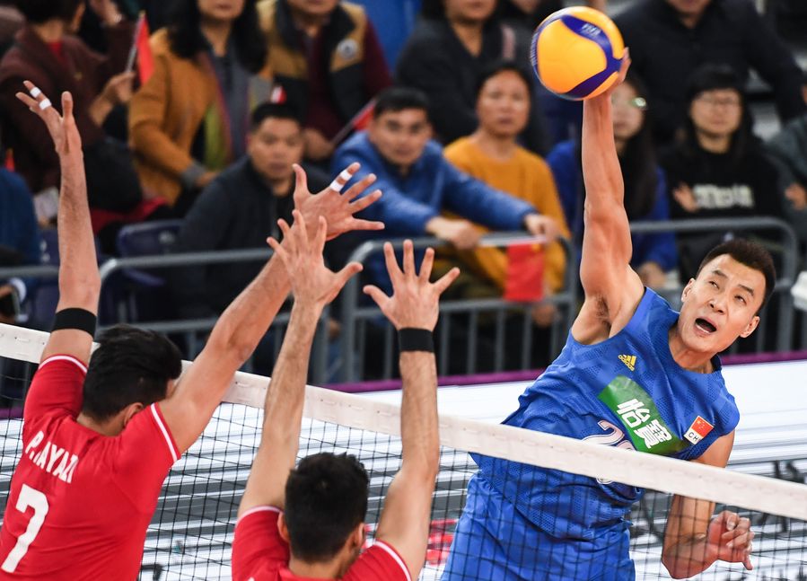 China's Cui Jianjun (R) spikes the ball during the final against Iran at AVC men's volleyball qualification for 2020 Tokyo Olympic Games in Jiangmen, south China's Guangdong Province, Jan. 12, 2020. (Xinhua/Deng Hua)