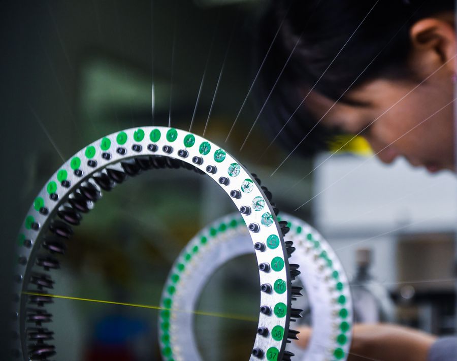 A worker inspects machines at a smart workshop of a hosiery company in Zhuji, east China's Zhejiang Province, Oct. 23, 2019. (Xinhua/Han Chuanhao)
