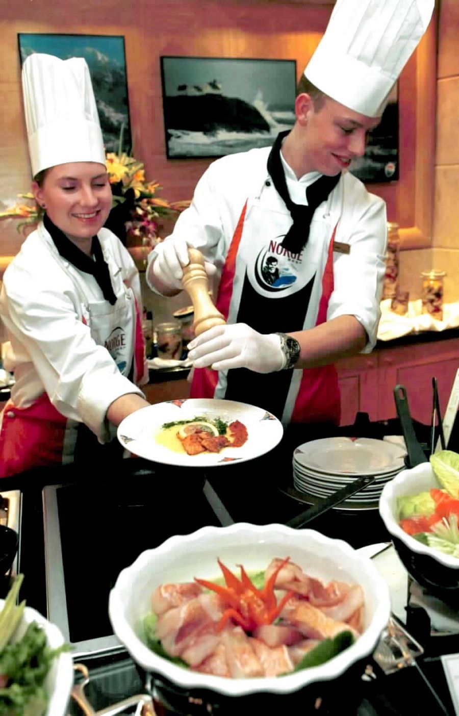 File photo shows Norwegian chefs preparing salmon during a Norwegian seafood festival held in Beijing.(Xinhua/Zhang Yanhui)