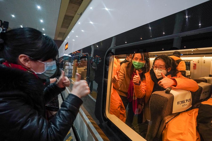 A relative encourages the medical staff at Nanjing South Railway Station in Nanjing, east China's Jiangsu Province, Jan. 25, 2020. The first group of 147 medical staff of Jiangsu Province left for Wuhan, the center of the novel coronavirus (2019-nCoV) outbreak, to provide medical aid. (Xinhua/Li Bo)