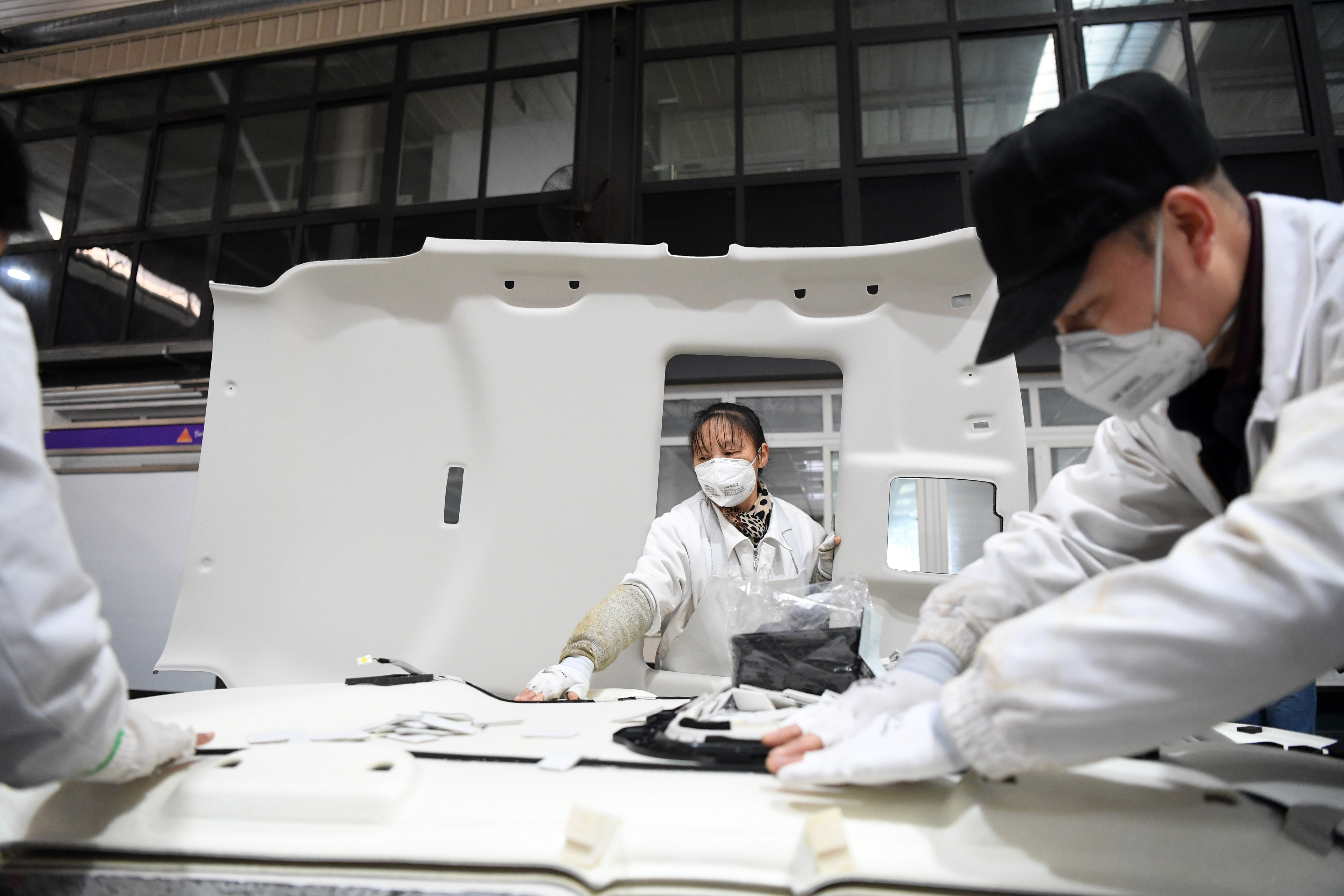 Employees work at the workshop of Faurecia (Chongqing) Automotive Parts Co., Ltd, a Sino-French joint venture, in southwest China's Chongqing Municipality, Feb. 12, 2020. (Xinhua/Tang Yi)