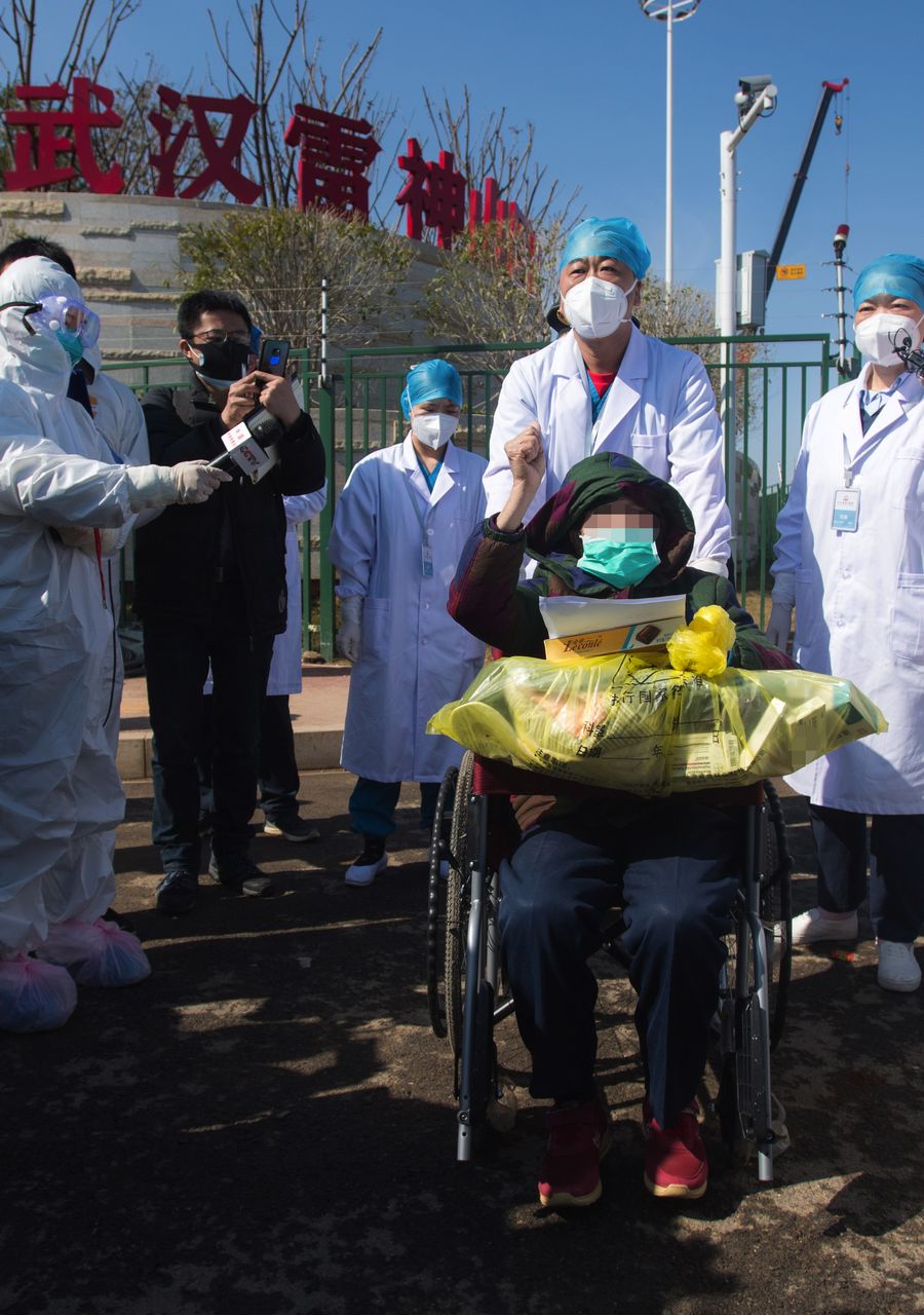 An 83-year-old cured patient gestures as she leaves the Leishenshan (Thunder God Mountain) Hospital in Wuhan, capital of central China's Hubei Province, Feb. 18, 2020.(Xinhua/Xiao Yijiu)